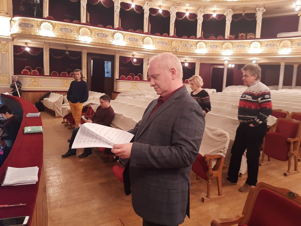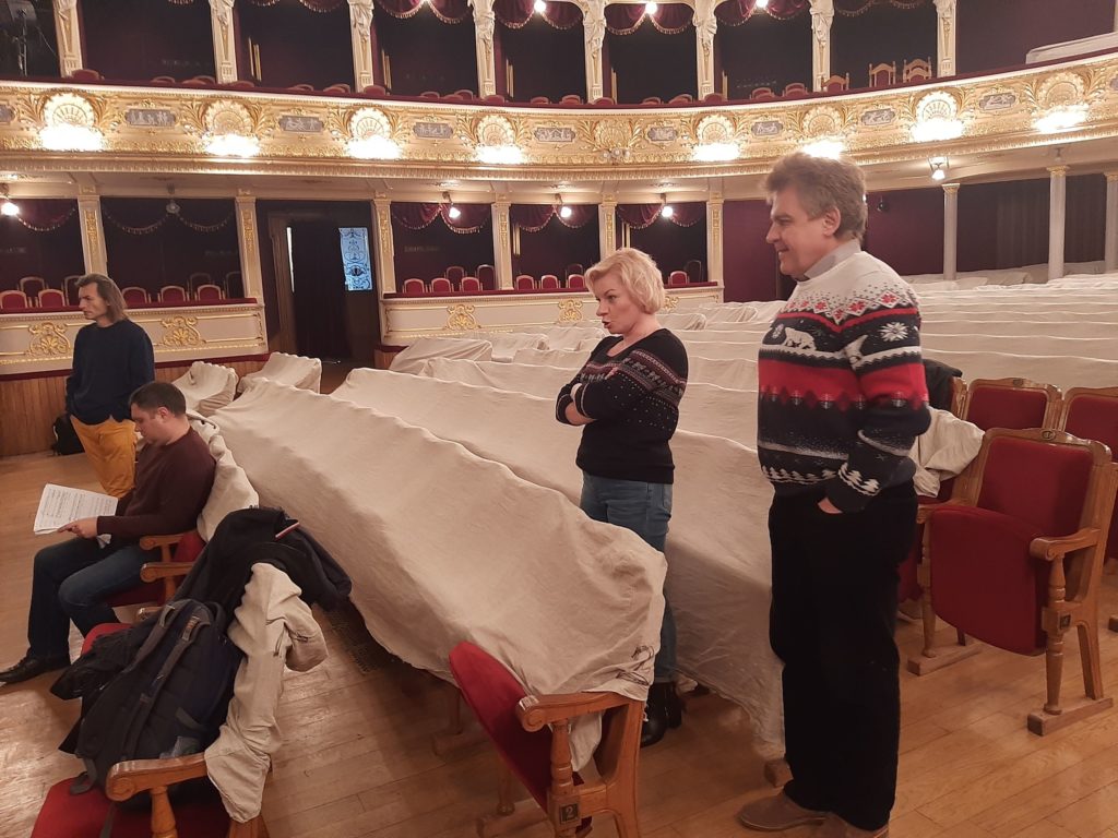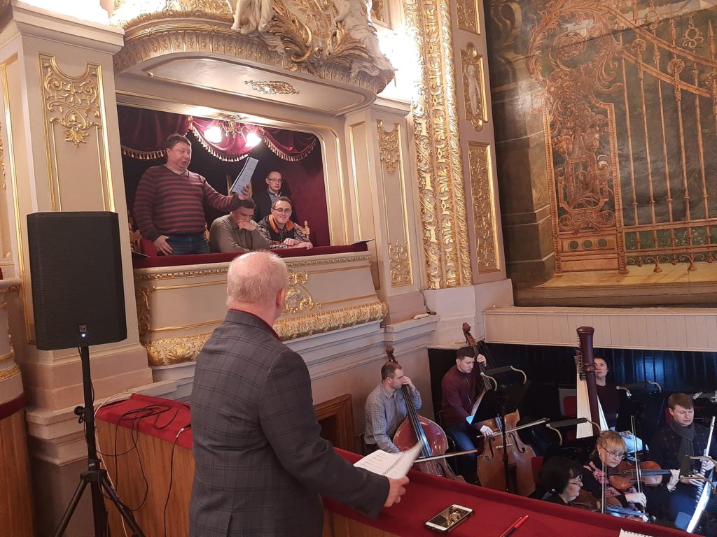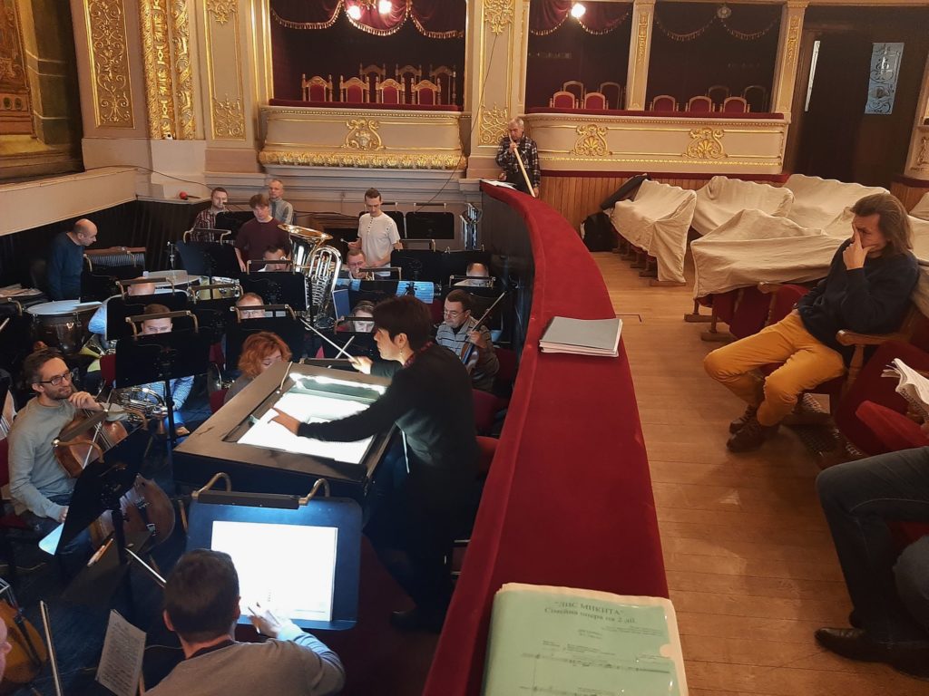 Репетиція сьогодні йде на трьох майданчиках: у хоровому й балетному класах, в оркестровому каналі. До диригентського пульту стала Ірина Стасишин, яка працює над виставою разом із диригентом-постановником Теодором Кучаром.