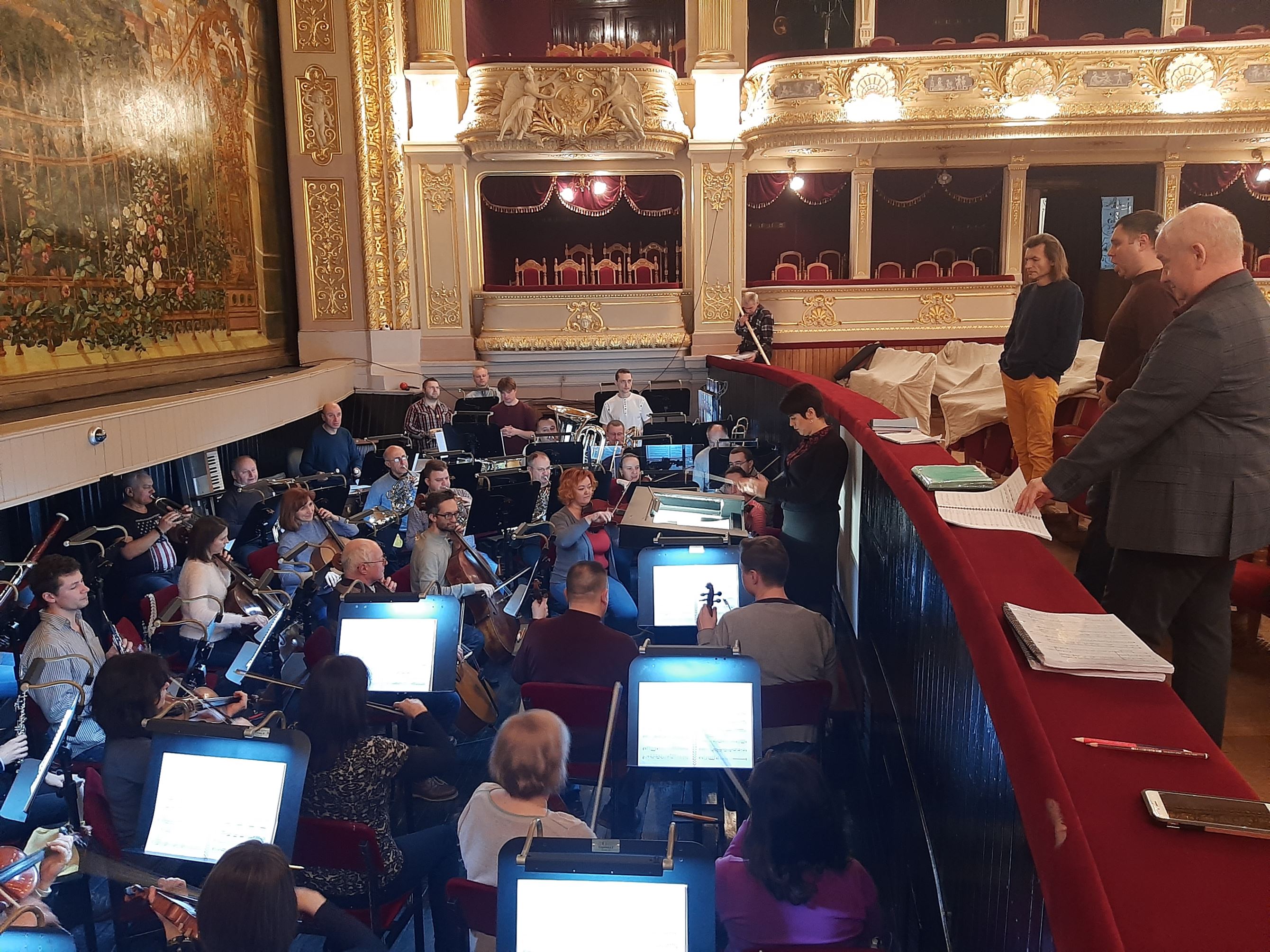 Репетиція сьогодні йде на трьох майданчиках: у хоровому й балетному класах, в оркестровому каналі. До диригентського пульту стала Ірина Стасишин, яка працює над виставою разом із диригентом-постановником Теодором Кучаром.