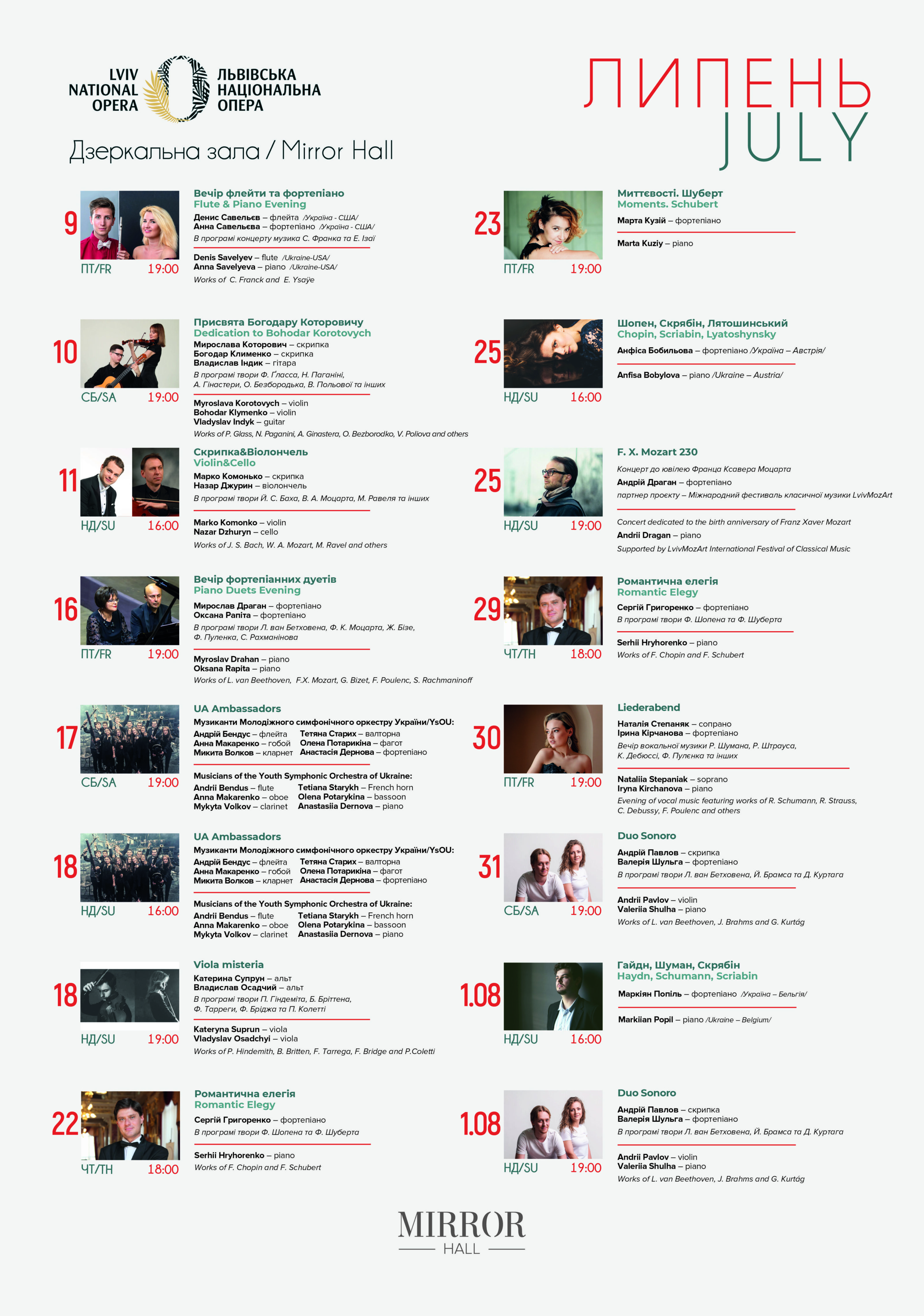 Впродовж липня запрошуємо на концерти у розкішному інтер’єрі Дзеркальної зали. На Вас чекає добірна музична програма для справжніх поціновувачів класичної музики у виконанні артистів Львівської національної опери та запрошених виконавців.