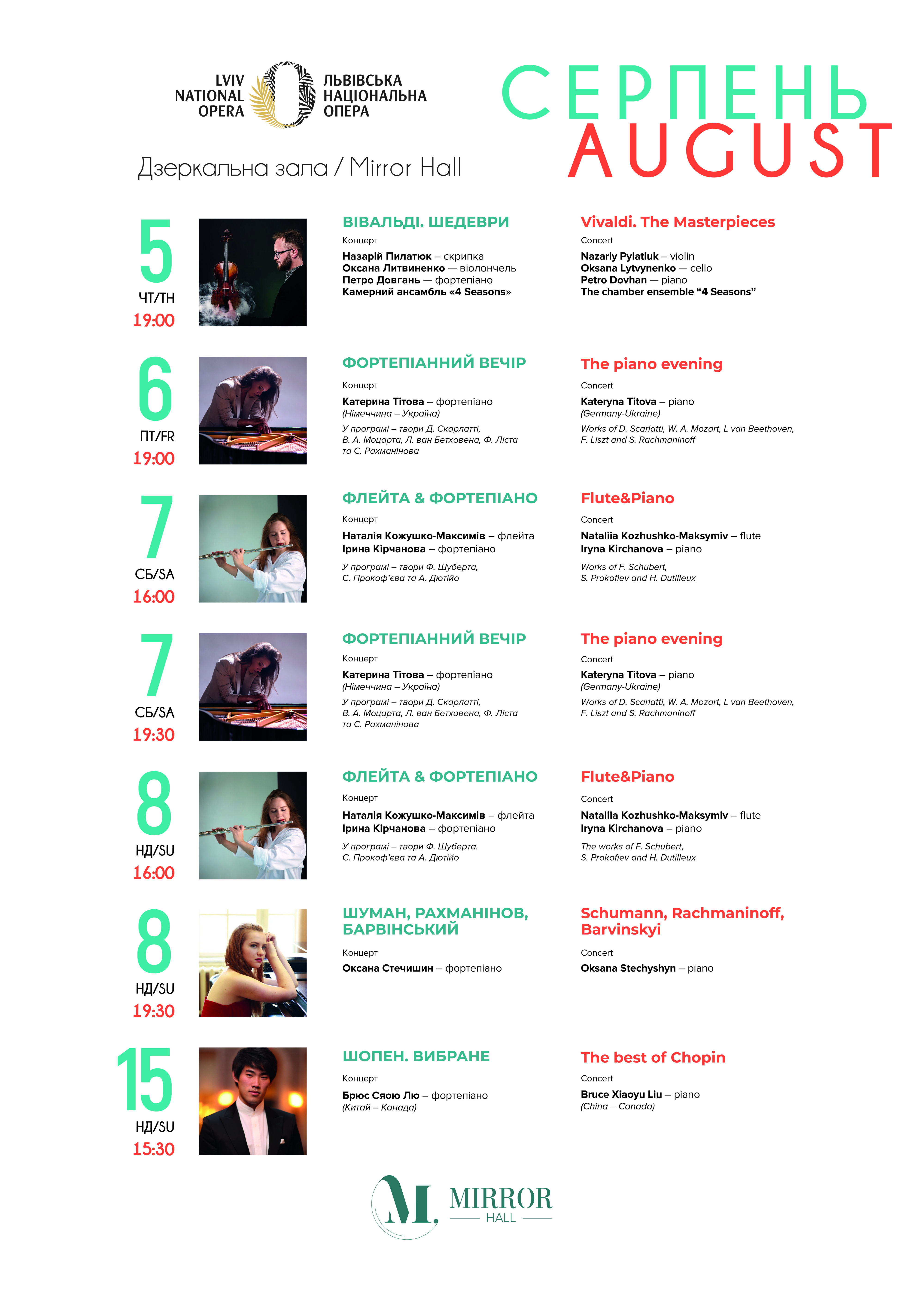 Останній місяць літа вибухне яскравою палітрою подій в музичному салоні Дзеркальної зали Львівської національної опери!