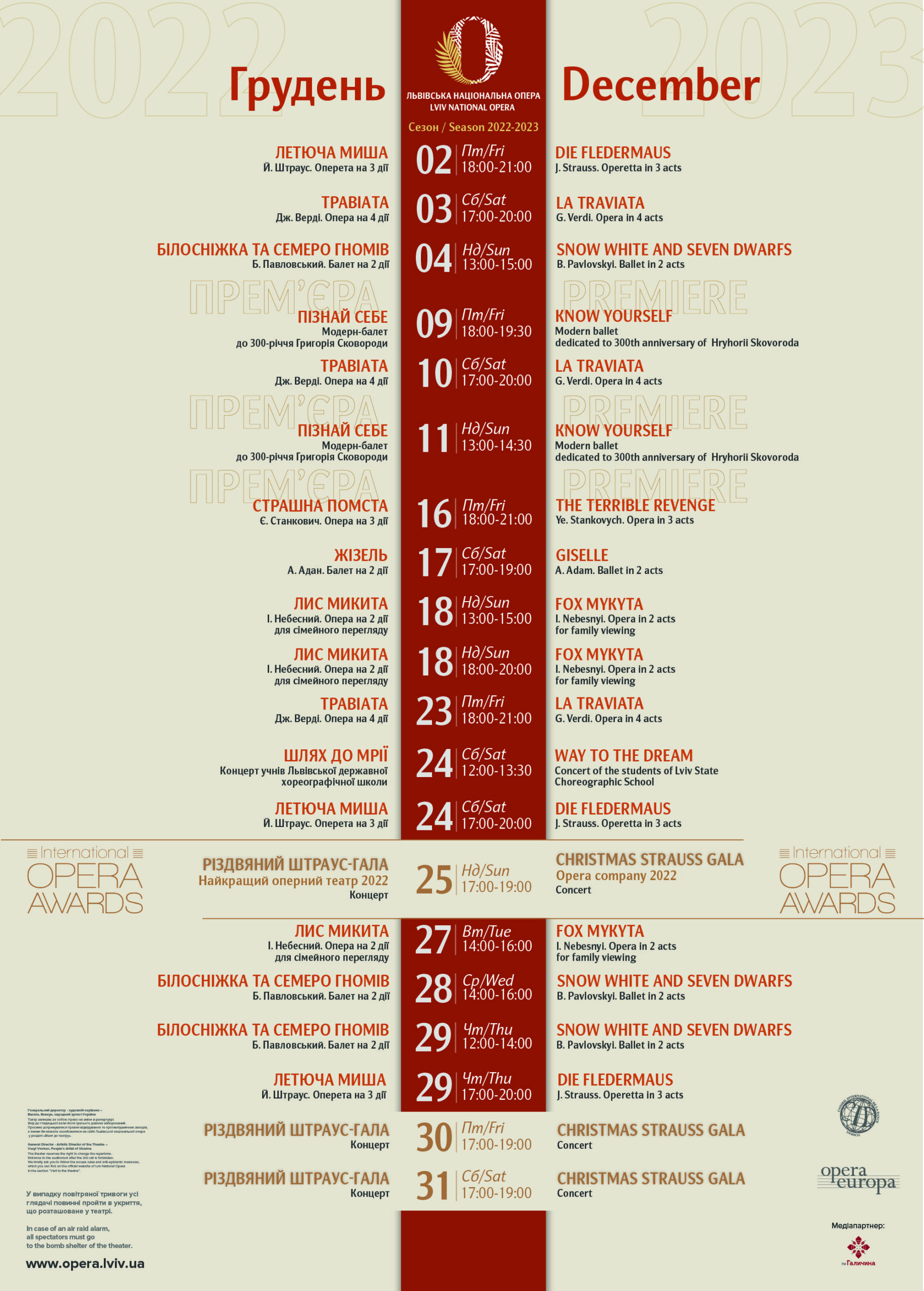 16 грудня, у зв’язку із хворобою солістів, замість опери «Страшна помста» Є. Станковича відбудеться оперета «Летюча миша» Й. Штрауса.https://archive.opera.lviv.ua/do-uvagy-glyadachiv-zamina-vystavy-16-grudnya/