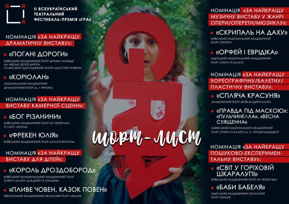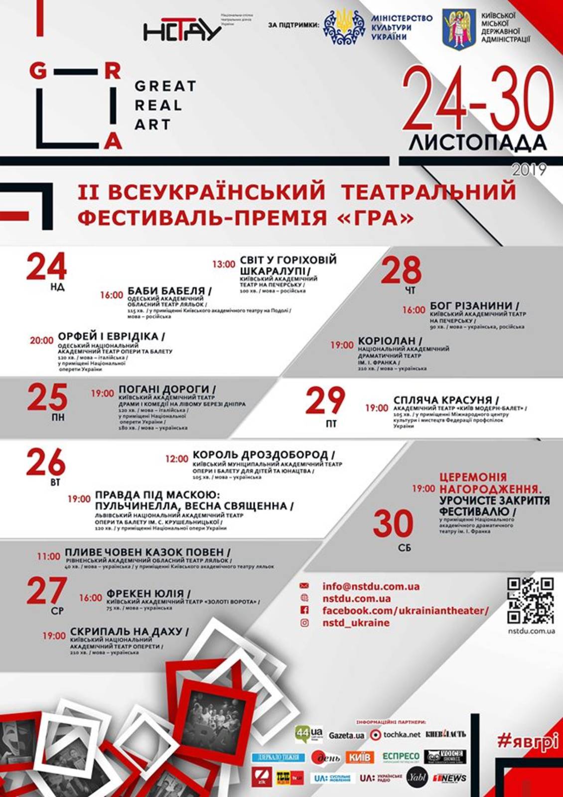 З 24 по 30 листопада у м.Києві пройде фінал ІІ Всеукраїнського театрального фестивалю-премії ГРА. Це 12 кращих вистав України. Оцінюватимуть номінантів члени міжнародного журі. Цьогоріч лауреати будуть визначатися, як і минулого року, у шести загальних номінаціях.