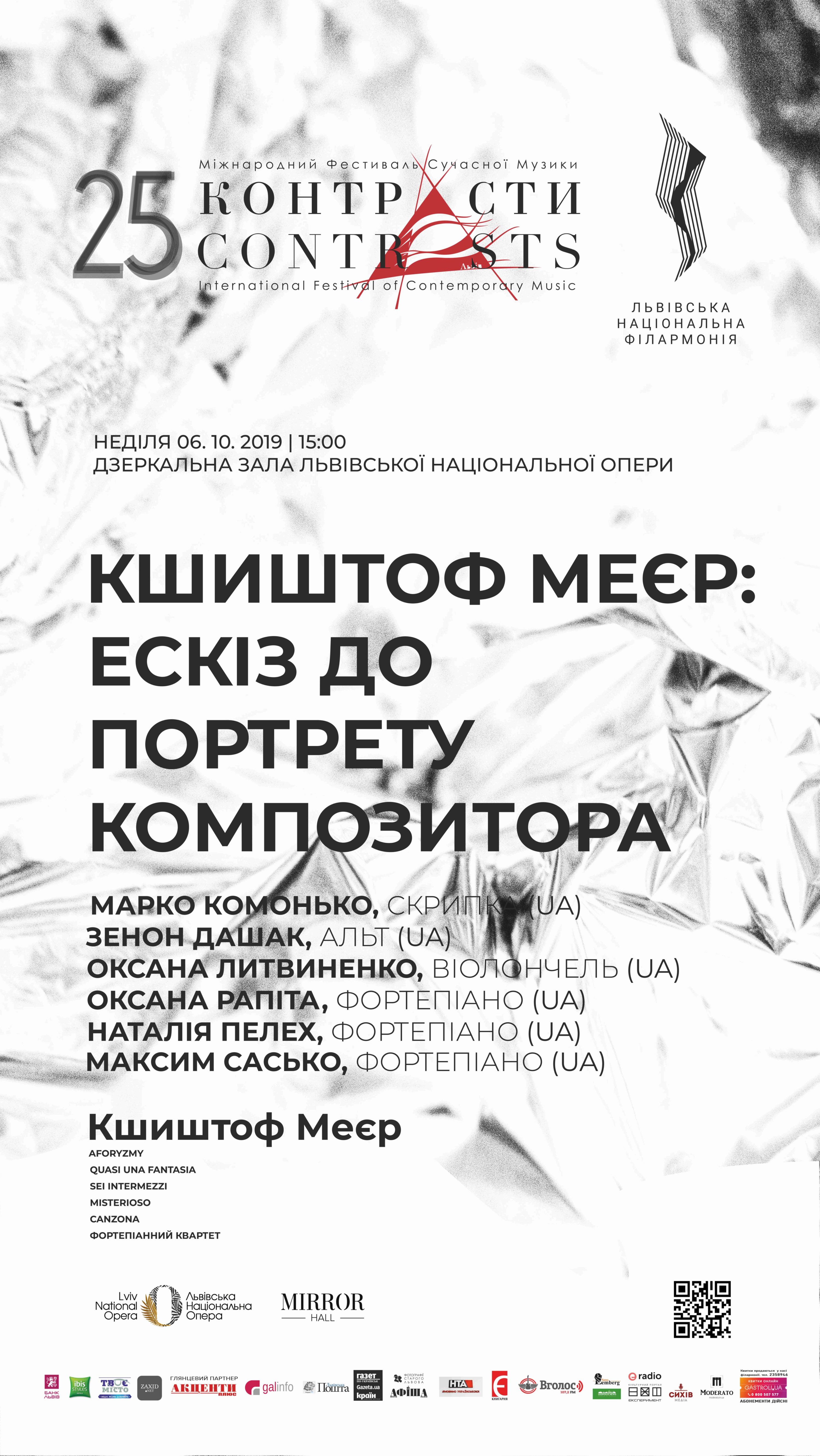 6 жовтня в Дзеркальній залі Львівської Національної Опери в рамках ювілейного 25 Міжнародного фестивалю сучасної музики «Контрасти» відбувся концерт «Кшиштоф Меєр: Ескіз до портрету композитора».