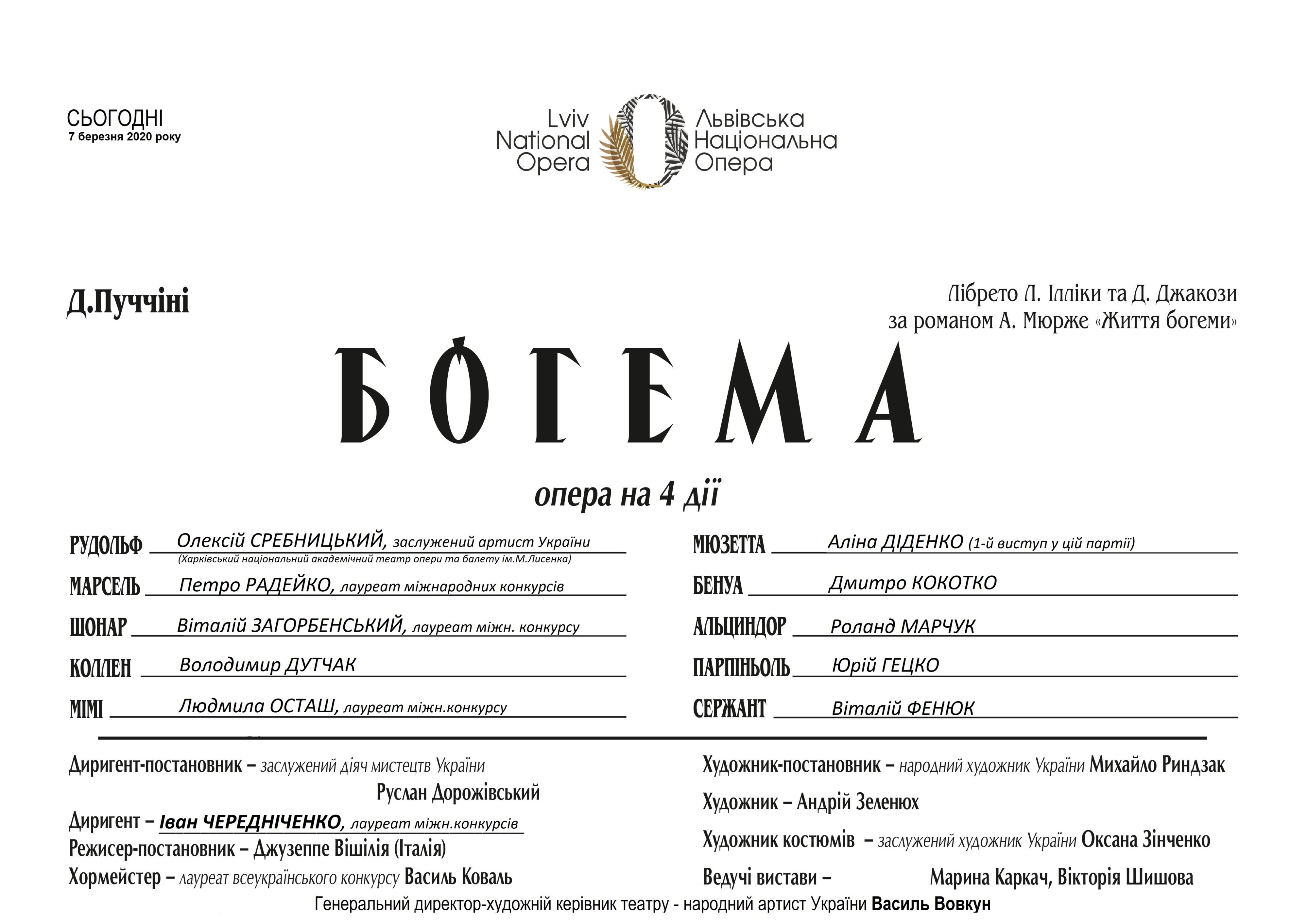 7 березня о 18:00 в партії Рудольфа в опері “Богема” Дж.Пуччіні виступить запрошений оперний співак, соліст Харківського національного академічного театру опери та балету ім. М.Лисенка, заслужений артист України Олексій Сребницький.