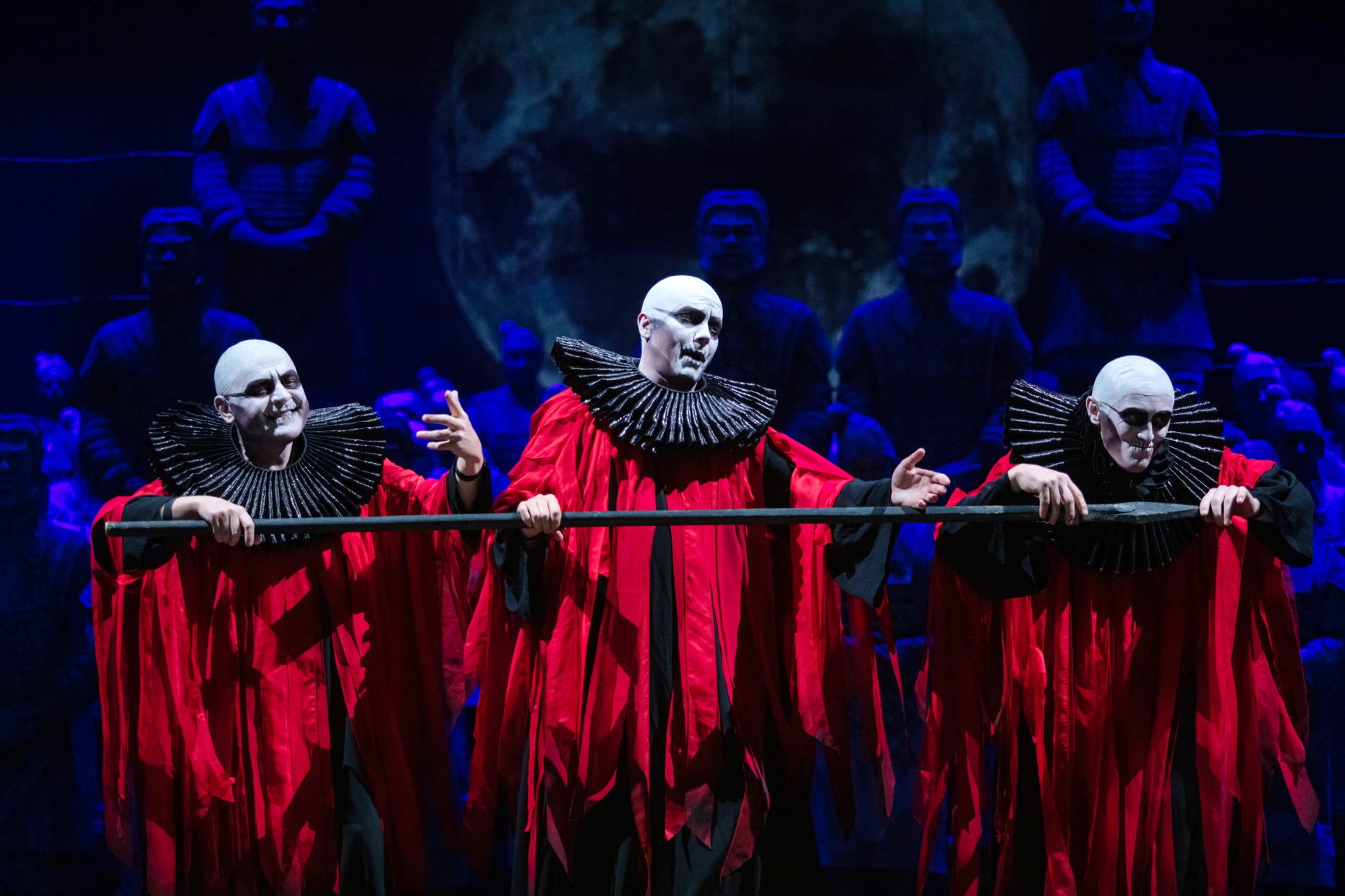 Складні та яскраві декорації монтуються на сцені не менш, ніж пів доби. Основним елементом сценографії є фігури теракотової армії, яких є на сцені 130. Вони втілюють наче скам’янілих очевидців і лише трагедія у фіналі опери викликає у них співчуття, а отже – життя;