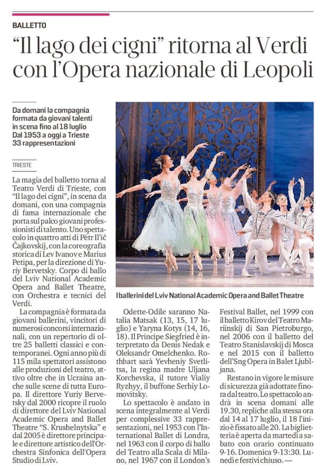 Впродовж 13-18 липня у Оперному театрі імені Джузеппе Верді у м. Трієст (Італія) тривають гастрольні виступи балетної трупи Львівської національної опери у балеті «Лебедине озеро» П. Чайковського.