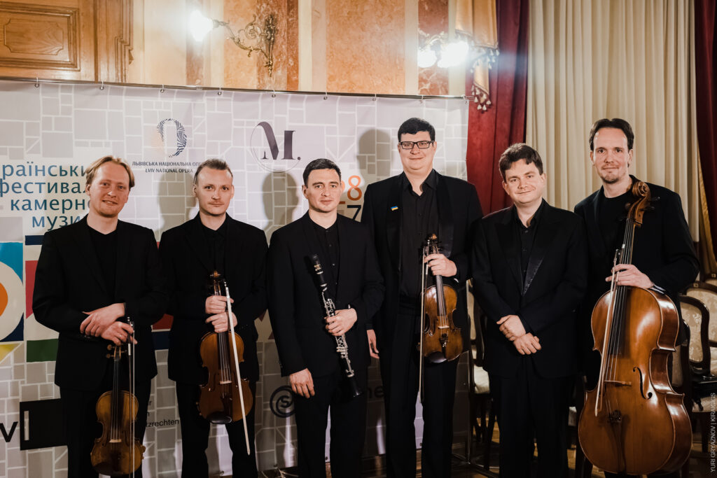 NotaBene Chamber Group (зліва направо): Андрій Павлов (скрипка), Ігор Завгородній (альт), Юрій Немировський (кларнет), Максим Грінченко (скрипка), Роман Лопатинський (фортепіано), Артем Полуденний (віолончель). Фото Юрія Грязнова