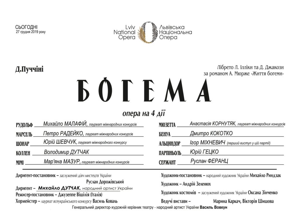 27 грудня у головних партіях виступлять: лауреат міжнародних конкурсів, Володарка Гран-прі V Міжнародного конкурсу оперних співаків ім. С. Крушельницької Мар’яна Мазур (Мімі) та лауреат численних престижних міжнародних конкурсів Михайло Малафій (Рудольф). За диригентським пультом – народний артист України Михайло Дутчак.