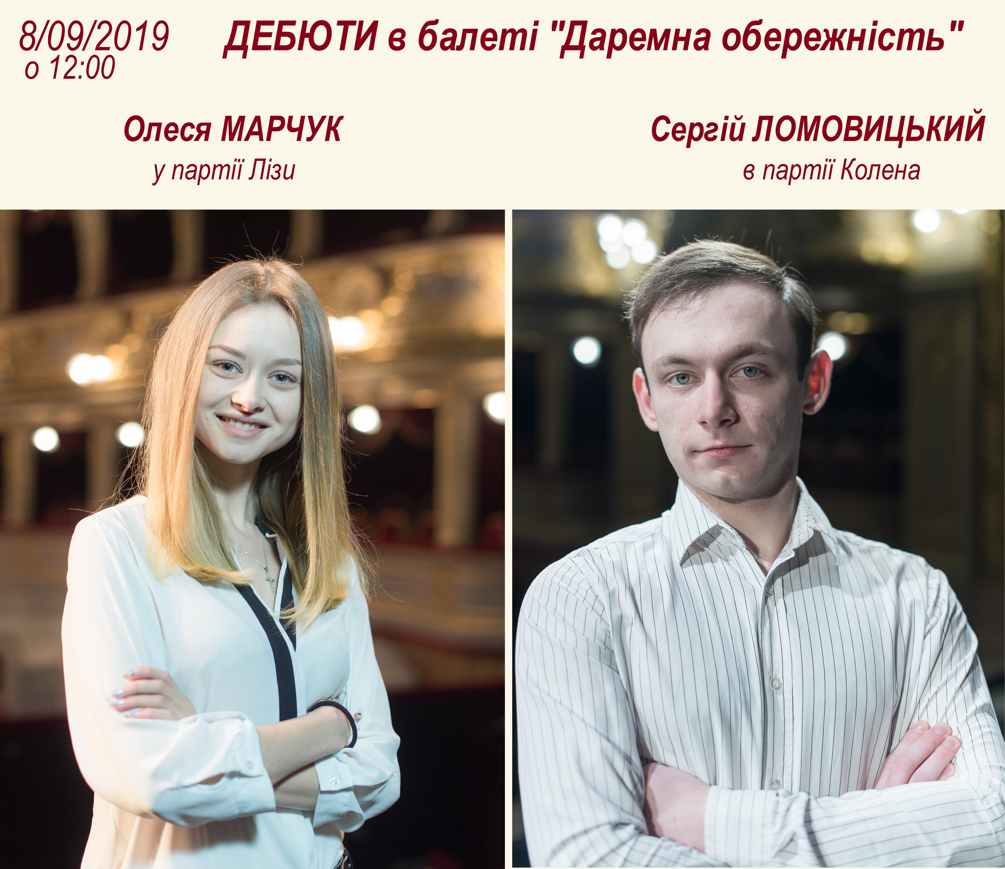 8 вересня о 12:00 в балеті «Даремна обережність» П.Гертеля ми вперше побачимо у головних партіях наших молодих артистів балету – Олесю Марчук (у партії Лізи) та Сергія Ломовицького (в партії Колена). Бажаємо гарного успішного виступу!