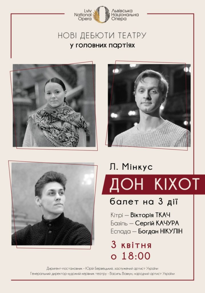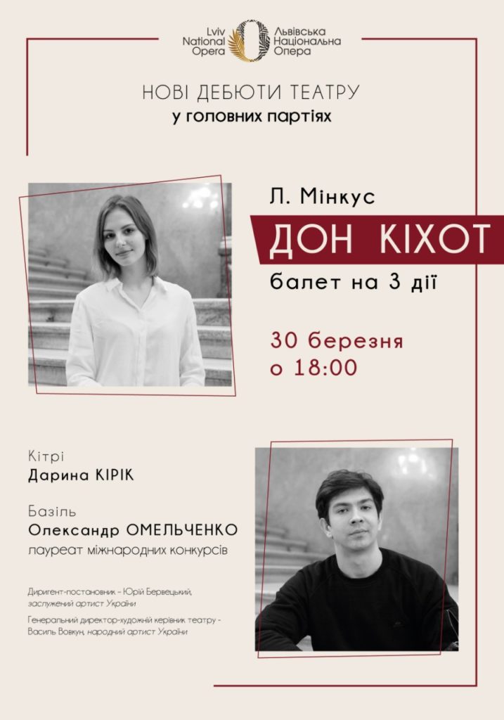 У партіях цих головних героїв 30 березня дебютують Дарина Кірік та Олександр Омельченко; а 3-ого квітня – Вікторія Ткач та Сергій Качура.