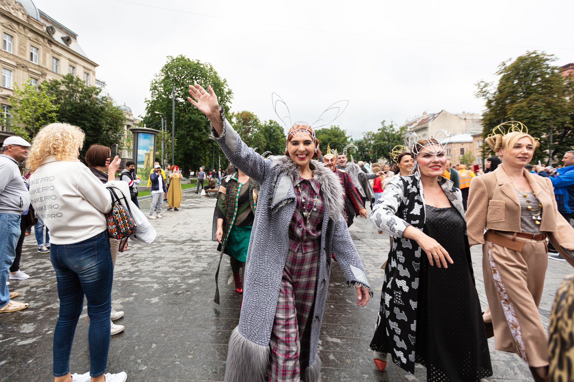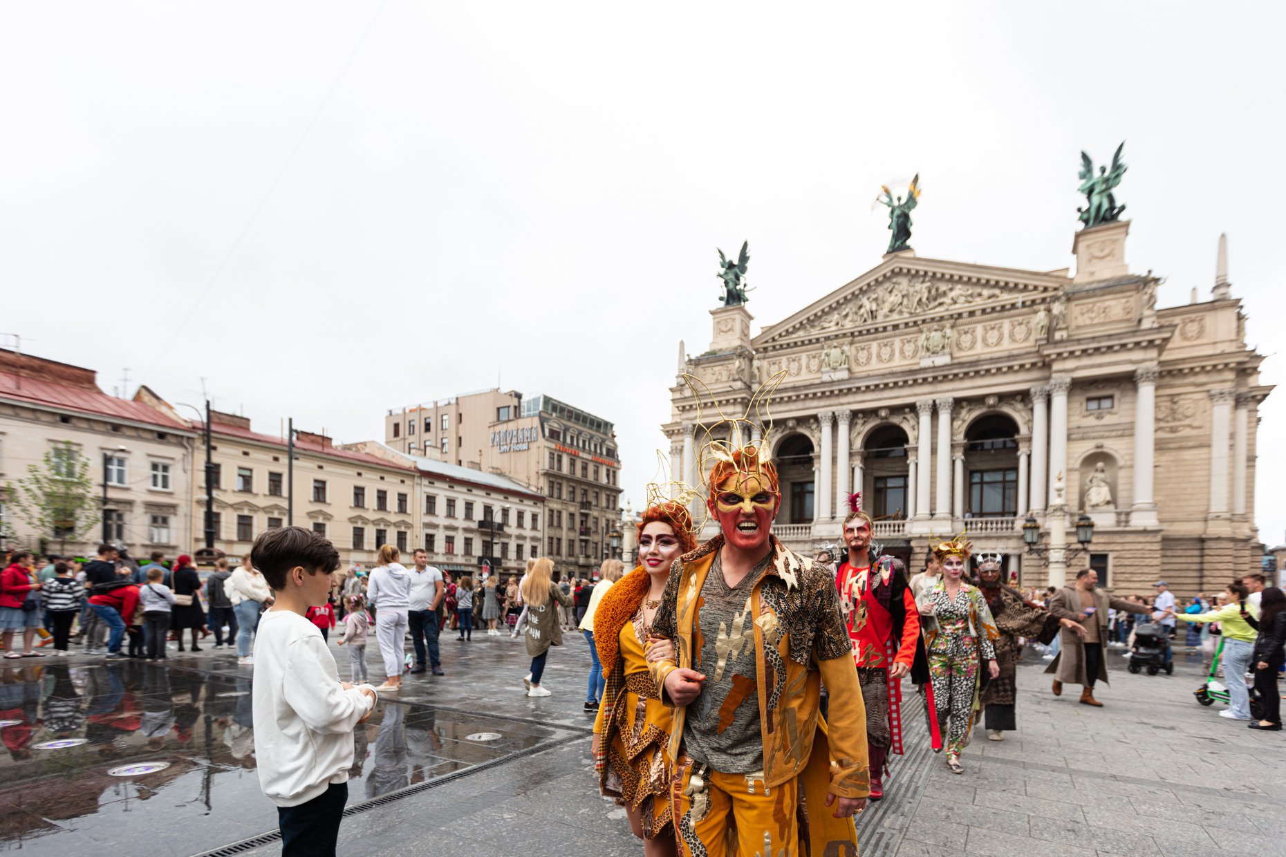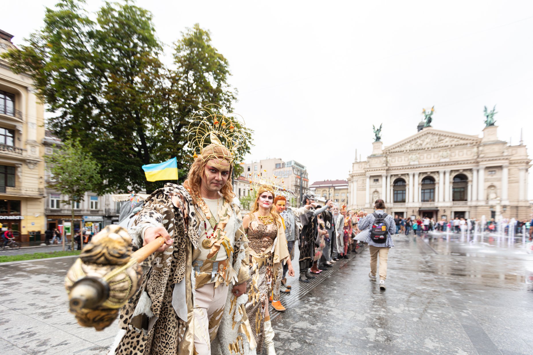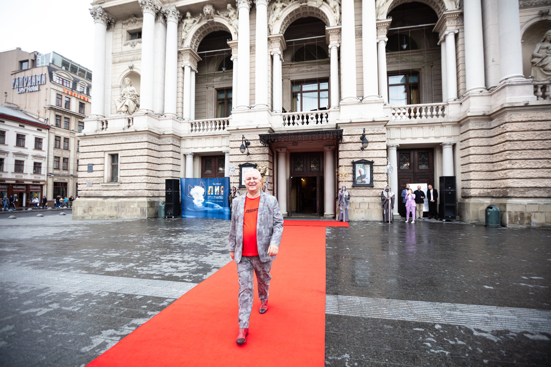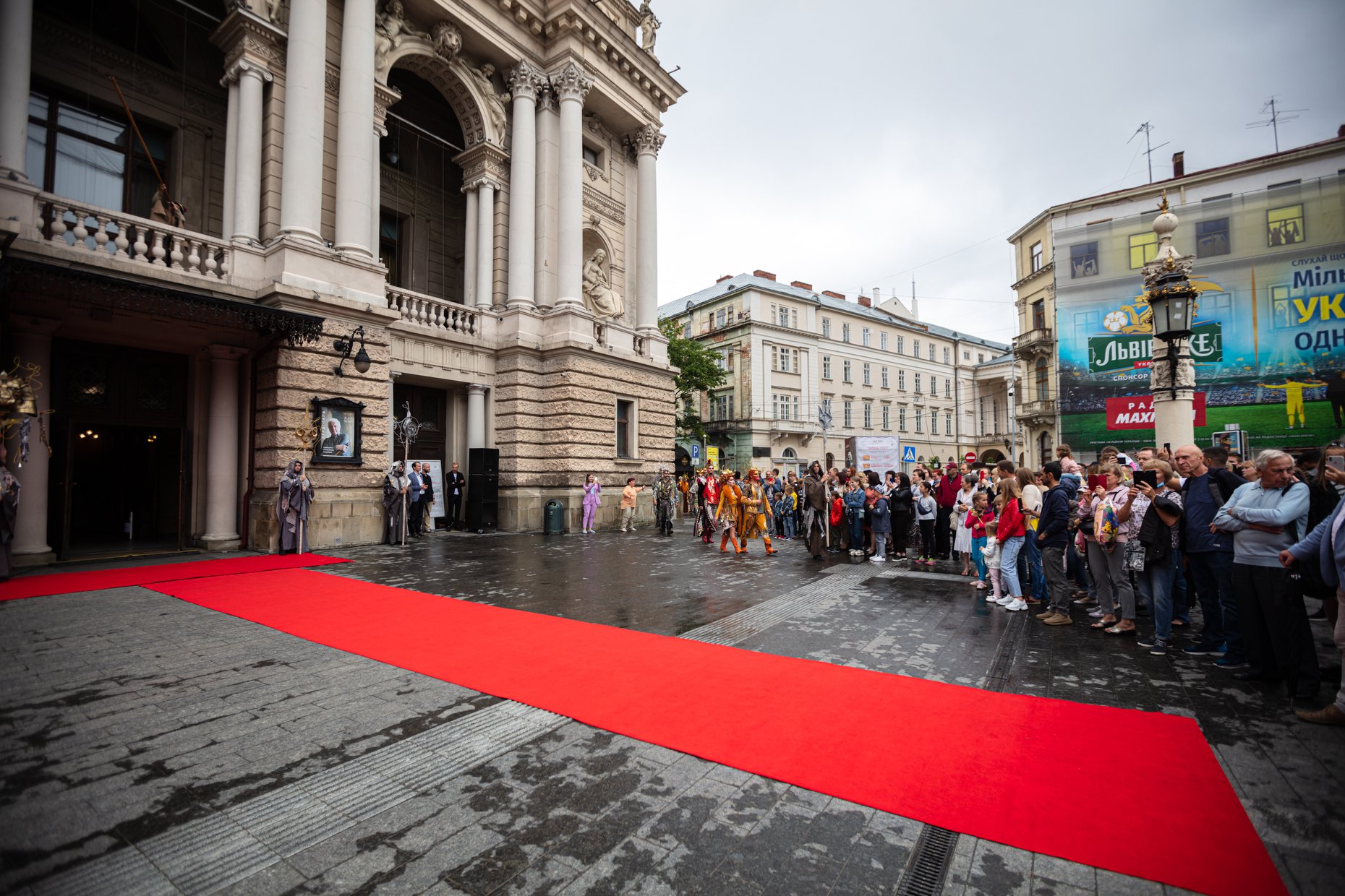 Дійство продовжило звучання духового квінтету з балкону театру, доки глядачі заходили до фоє Львівської національної опери та фотографувалися біля банеру опери «Лис Микита».