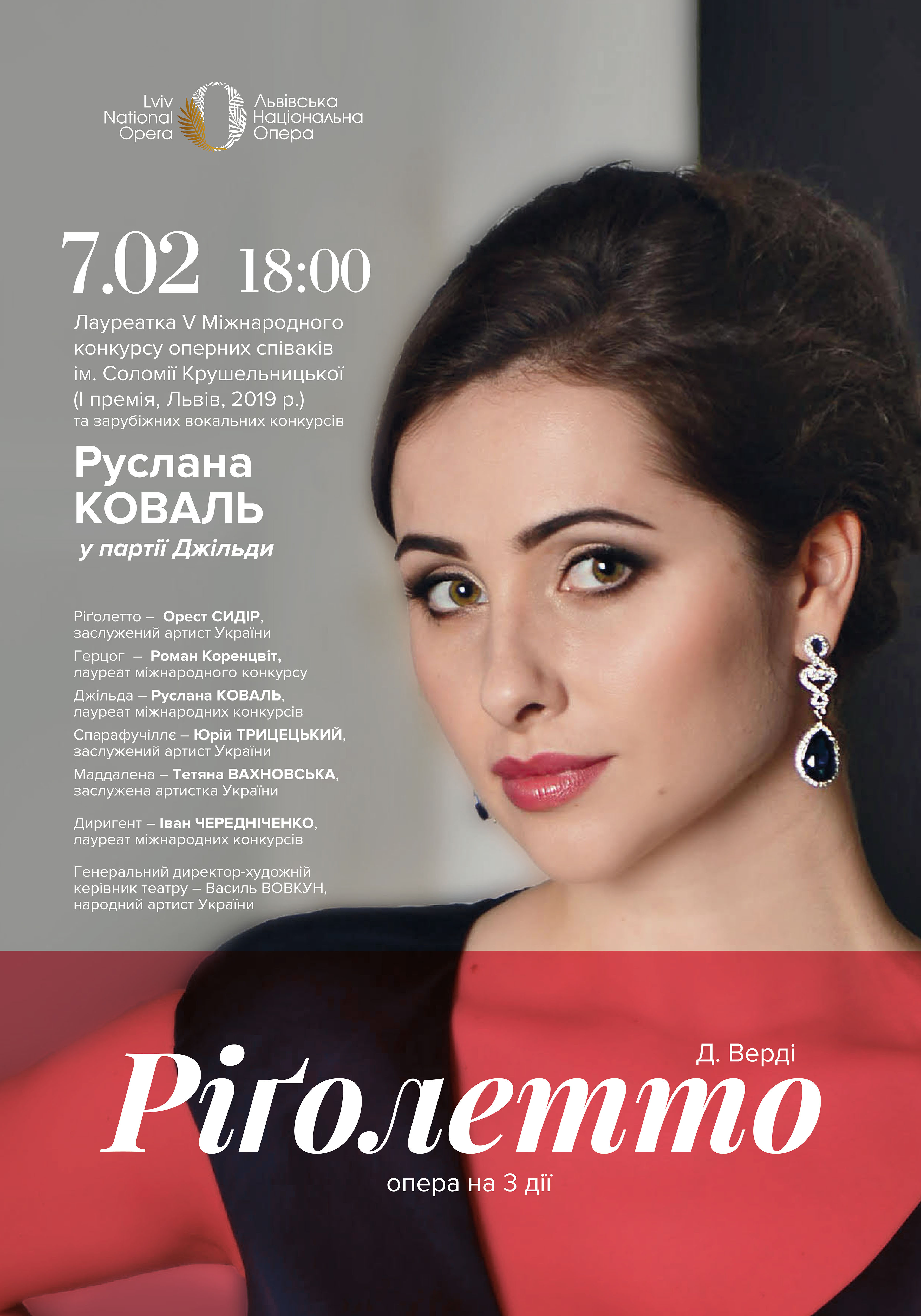 7 лютого о 18:00 з неперпінням чекаємо на виступ Руслани КОВАЛЬ в партії Джільди в опері «Ріголетто» Д.Верді.
