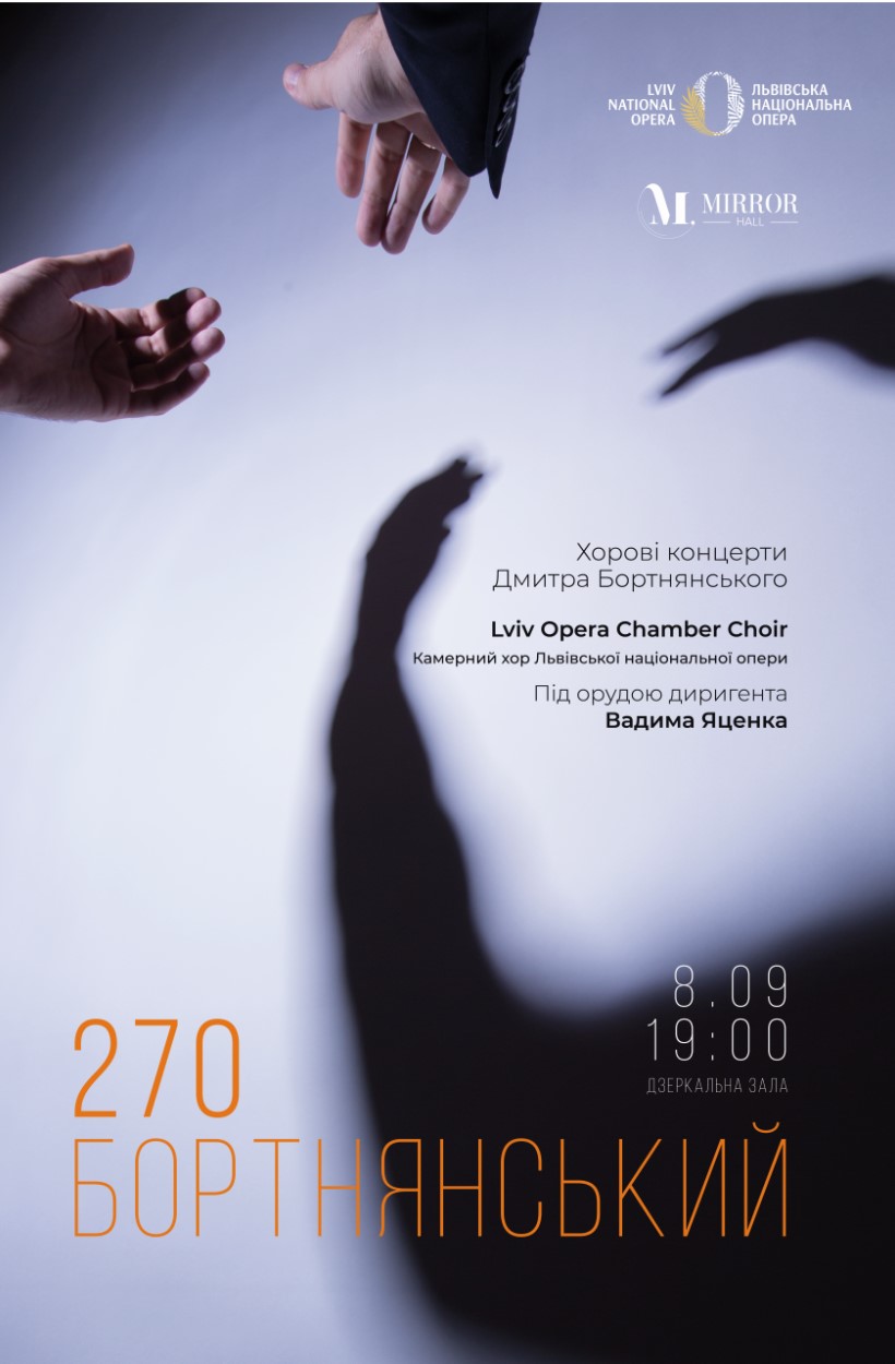 8 вересня о 19:00 у Дзеркальній залі Львівської національної опери у виконанні LvivOpera Chamber Choir під керівництвом диригента Вадима Яценка прозвучать хорові духовні концерти Дмитра Бортнянського.