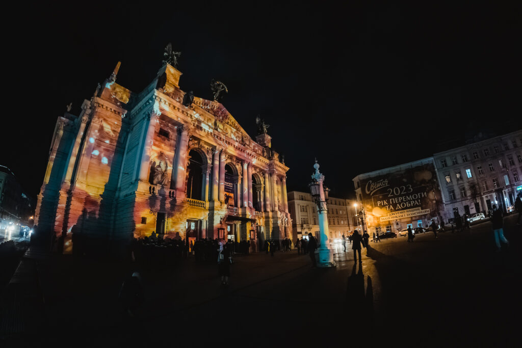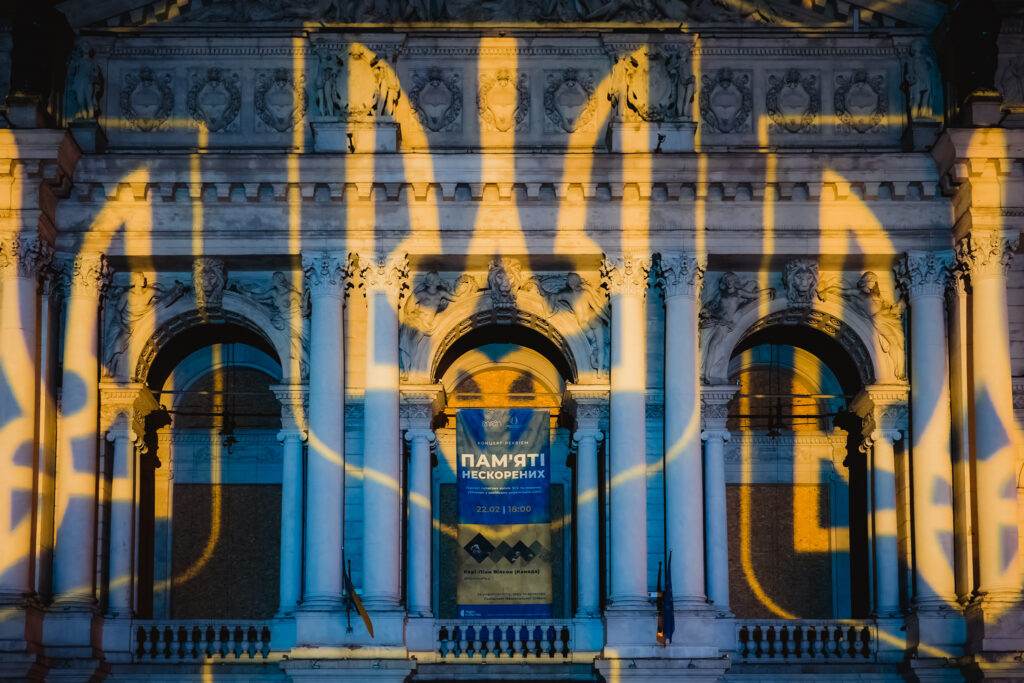 Художні проєкції швейцарського митця Геррі Хофштеттера на фасаді Львівської опери, присвячені річниці повномасштабної війни в Україні