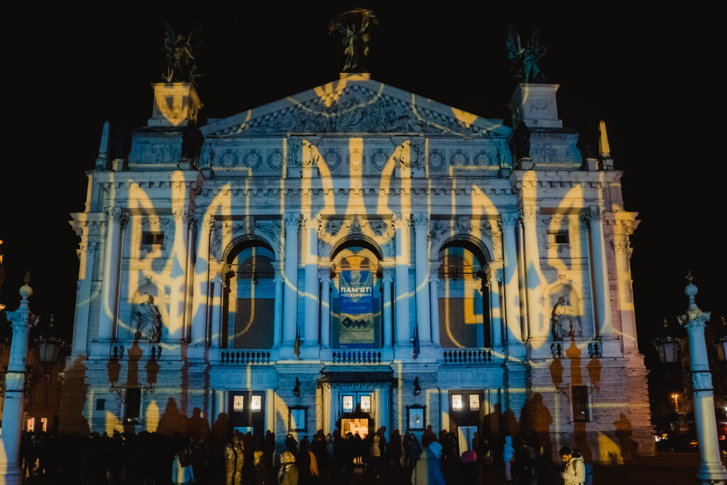 Швейцарський митець Геррі Хофштеттер підсвітив будівлю Львівської національної опери, аби вшанувати пам’ять жертв російської агресії в межах арт-туру містами України.