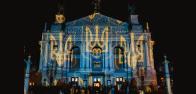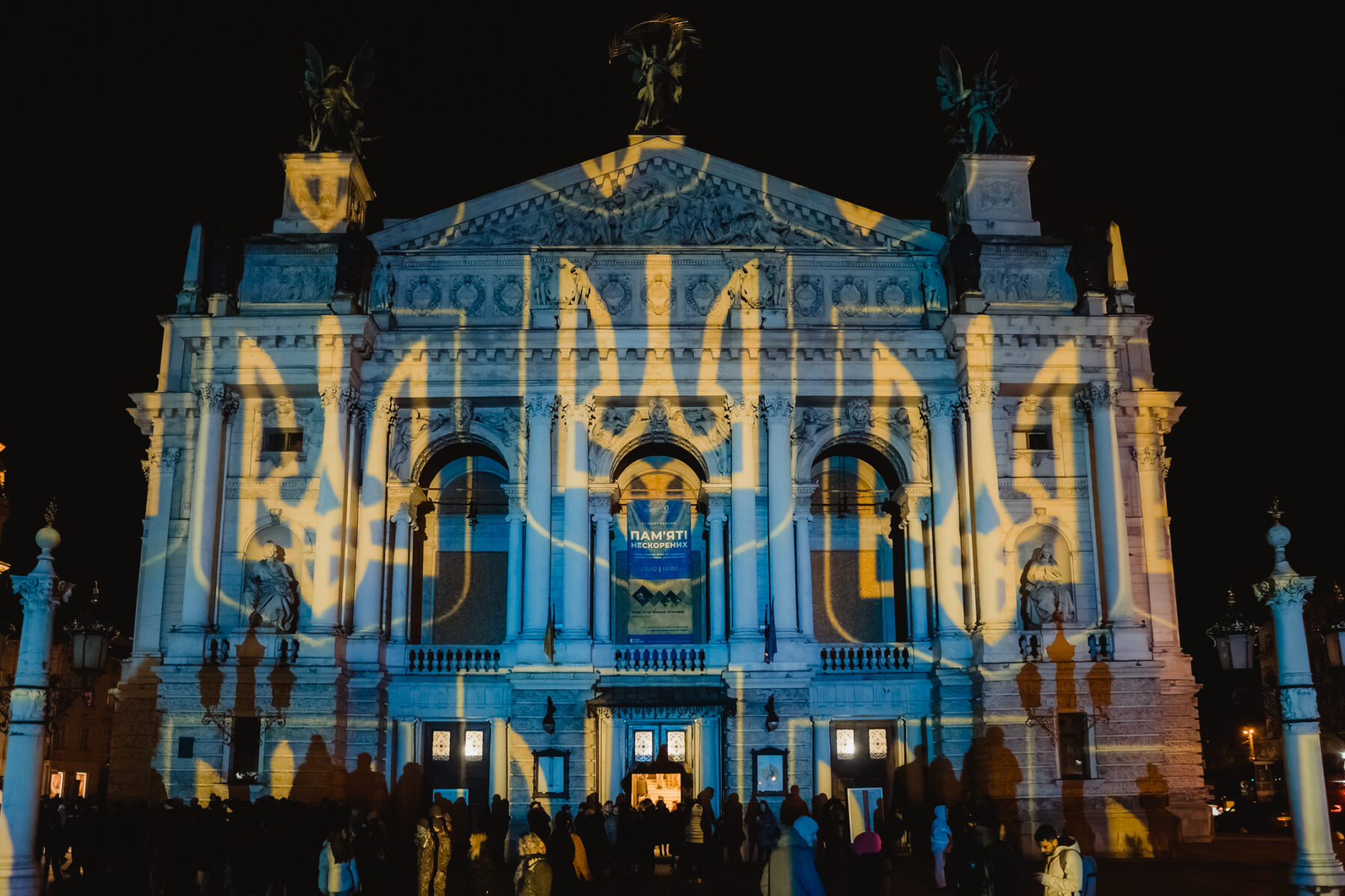 Художні проєкції швейцарського митця Геррі Хофштеттера на фасаді Львівської опери, присвячені річниці повномасштабної війни в Україні