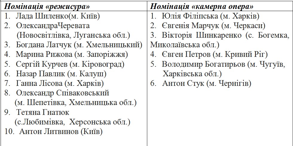 Конкурс проводиться у двох у номінаціях: “камерна опера” та “режисура”. Заявки на участь подали 16 претендентів – молодих композиторів та режисерів: