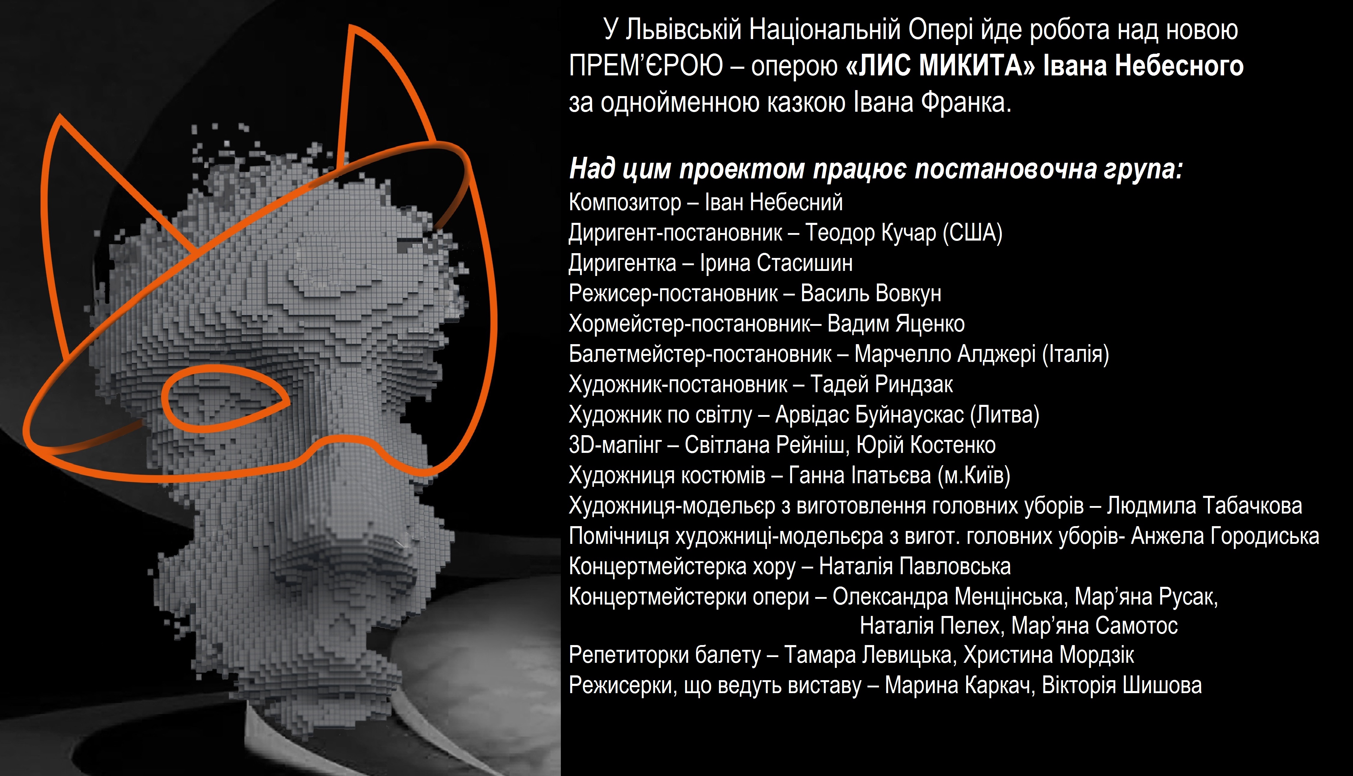 Опера «Лис Микита» на львівській сцені буде втілена в оригінальному трактуванні режисера-постановника народного артиста України Василя Вовкуна, вона здивує і захопить глядачів – як дітей, так і дорослих.
