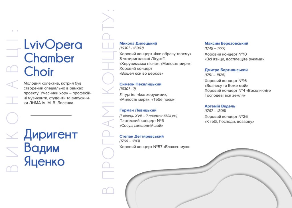 Сьогодні, 4 червня, у дзеркальній залі Львівського національного академічного театру опери та балету імені Соломії Крушельницької відбувся чудовий концерт із творів М.Березовського, М.Дилецького, Д.Бортнянського, А.Веделя . Диригував лауреат всеукраїнського конкурсу Вадим Яценко. Переповнений слухачами зал щиро вітав артистів, обдаровуючи їх гарячими оплесками та вигуками браво. Серед почесних гостей, яких зібрав святковий зал, були викладачі львівської та київської музичних академій. Вони охоче висловили свою похвальну думку про музичну подію.