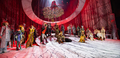 Сцена з опери “Лис Микита” у світлових декораціях та мальованих лаштунках.