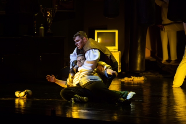 (Lviv, 11. September 2021) Dieser Herakles muss zum Jagen getragen werden. Auch Helden werden also nicht als solche geboren. Eine Art Coach muss ihm erst noch heldenhaftes Betragen beibringen. Der deutsche Regisseur Andreas Weirich und seine ebenfalls aus Deutschland stammende Ausstatterin Anna Schöttl haben für ihre Inszenierung an der Oper Lviv diesen unfertigen Helden, der so gar keine Lust aufs Heldenleben zeigt, in eine Art Boxclub verfrachtet – mit Referenz an die Verehrung des Boxsports in der Ukraine – siehe die Brüder Klitschko. Da steht er nun, der arme Held, zwischen von der Decke hängenden Boxsäcken und Monitoren mit Boxkämpfen und wirkt eher verängstigt. Ein ängstlicher Hüne, den der phantastische Countertenor Stanislav Tsema da abgibt, was schon durch seine enorme Statur grotesk wirkt.