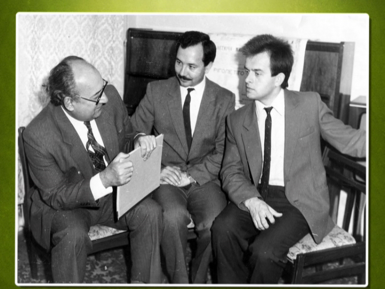 На архівних фото театру – молодий диригент Михайло Дутчак; разом із диригентами І. Лацаничем та М. Юсиповичем, та в розмові з Маестро Мирославом Скориком.