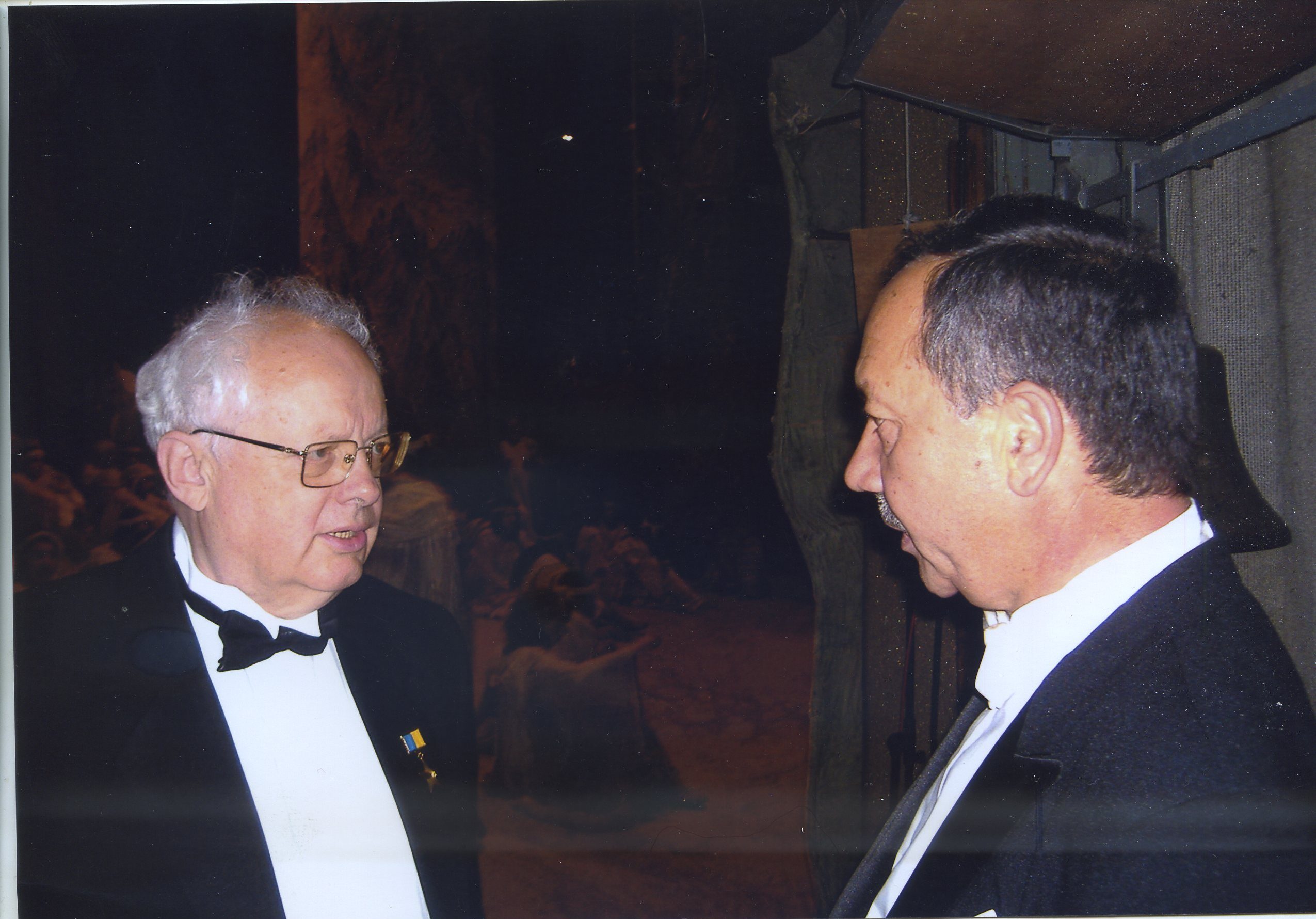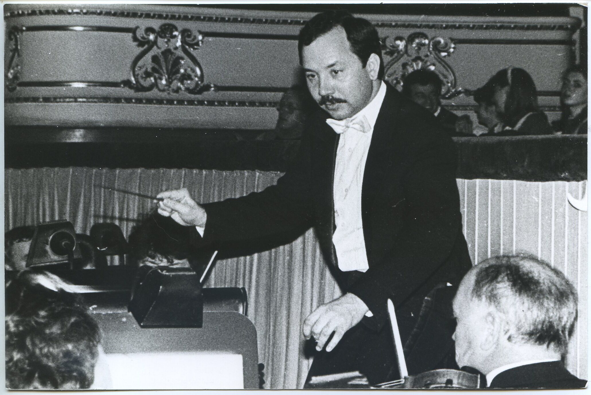 На архівних фото театру – молодий диригент Михайло Дутчак; разом із диригентами І. Лацаничем та М. Юсиповичем, та в розмові з Маестро Мирославом Скориком.