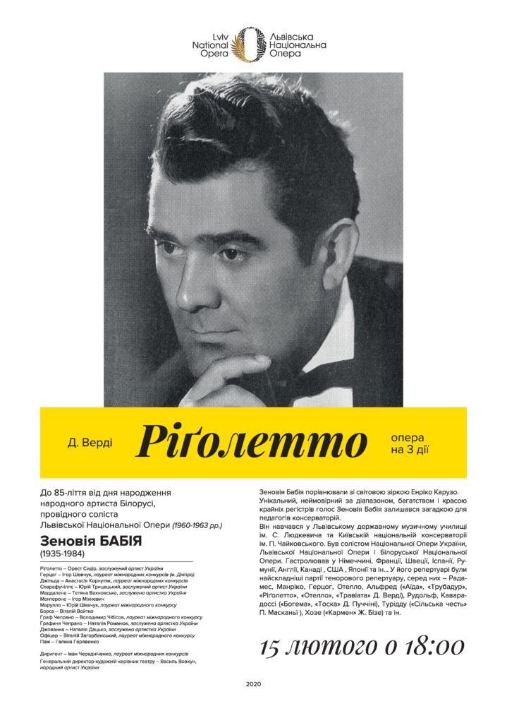 Вистава буде присвячена 85-річчю від дня народження народного артиста України ЗЕНОВІЯ БАБІЯ (1935 – 1984).
