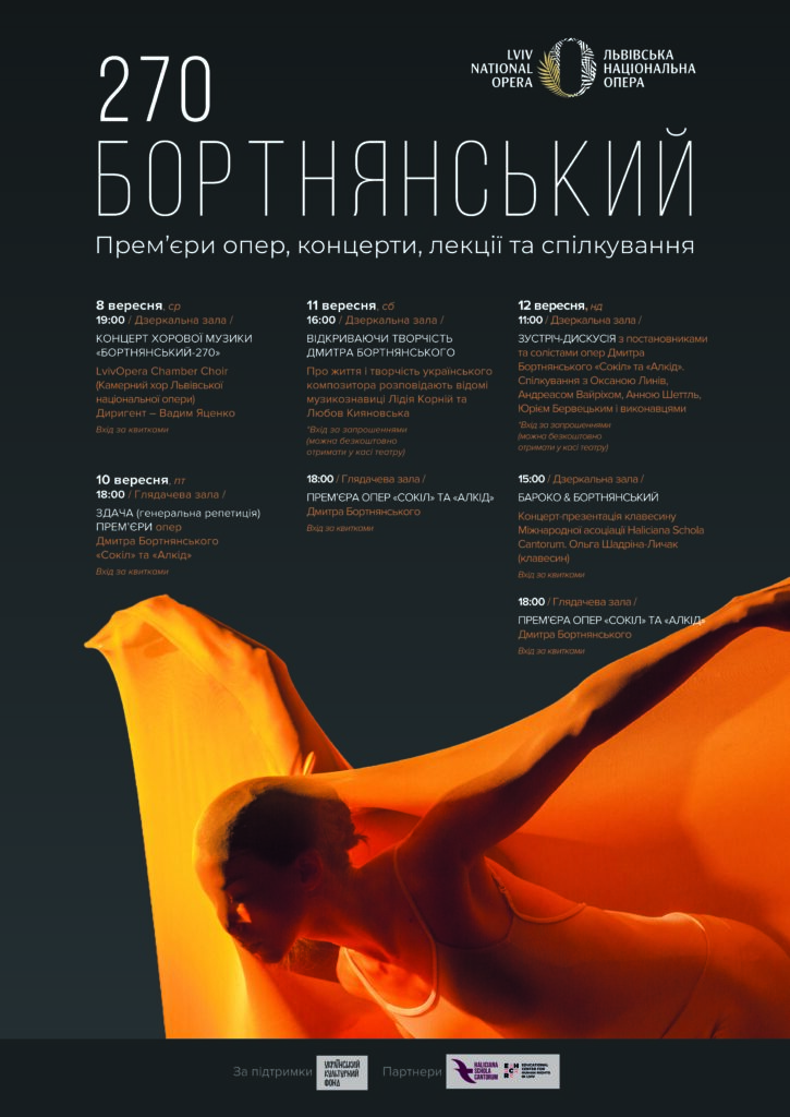 Перелік заходів в рамках прем’єри опер «Сокіл» та «Алкід» Д. Бортнянського та відзначення 270-ої річниці з дня народження композитора: