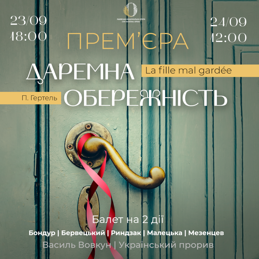 Вже 23 та 24 вересня Львівська національна опера презентує першу прем’єру нового театрального сезону – балет «La fille mal gardée, або Даремна обережність» Петера Гертеля. Постановники зазначають, твір – один з найбільш життєрадісних, світлих та комедійних в історії балету, та подарує можливість відчути такі потрібні миті радості та заспокоєння.