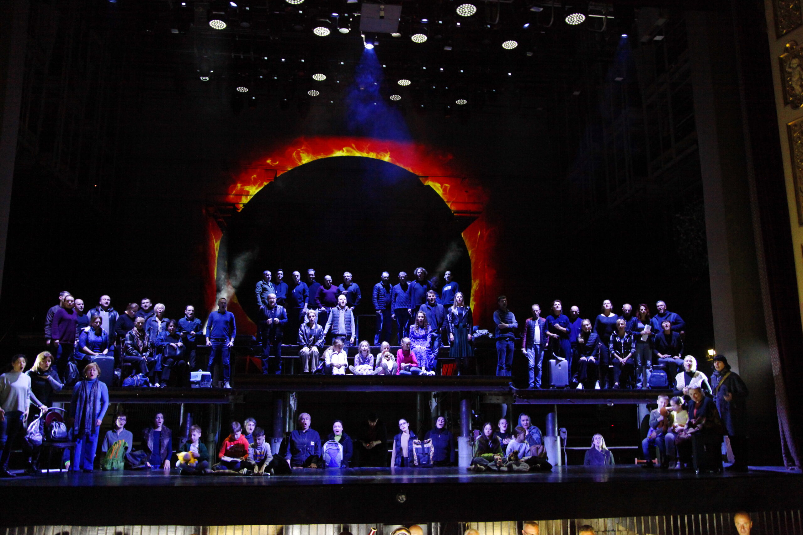 Кілька слів на завершення варто присвятити цілісній концепції сценічного дійства та виконавцям. Режисер В. Вовкун і медіахудожник Олег Кіндратів використали три вельми влучних візуальних символи, пов’язаних зі світлинами, що облетіли увесь світ: натовп цивільних – жінок, дітей, старших людей, що ховались під мостом в Ірпені навесні 2022 р.; натовп, який очікував на вокзалі Харкова поїзду, щоби виїхати з бомбардованого міста; на задньому плані відеодекорація зруйнованого будинку. Вони одразу створили відповідний імпульс сприйняття і не змінювались впродовж всього дійства.