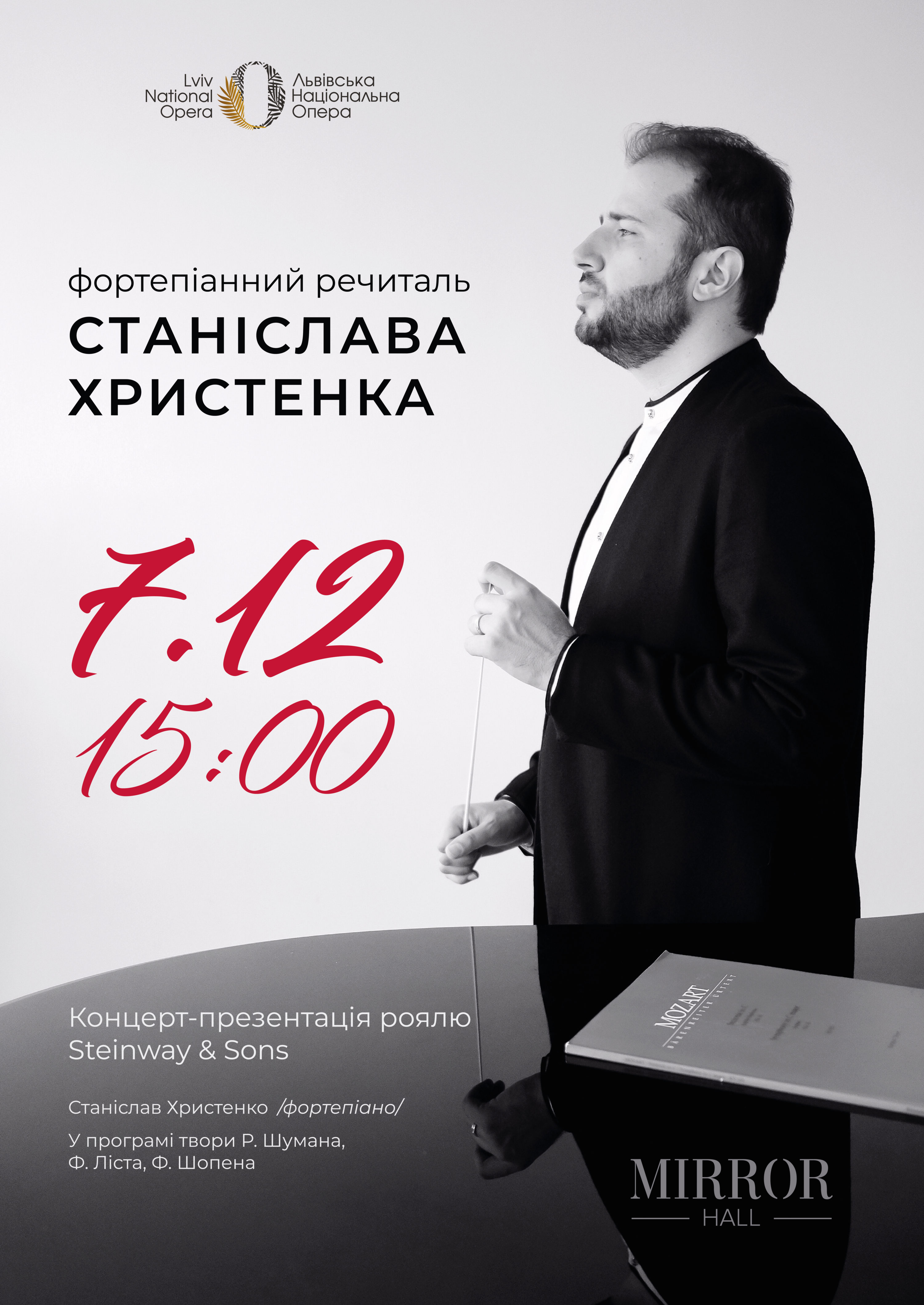 7-го грудня о 15:00 у Дзеркальній залі Львівської Національної Опери відбудеться концерт-презентація нового роялю Steinway & Sons, придбаного для виконання концертів камерної музики у цьому залі. Презентуватиме новий інструмент відомий український піаніст, артист компанії Steinway & Sons – Станіслав Христенко.