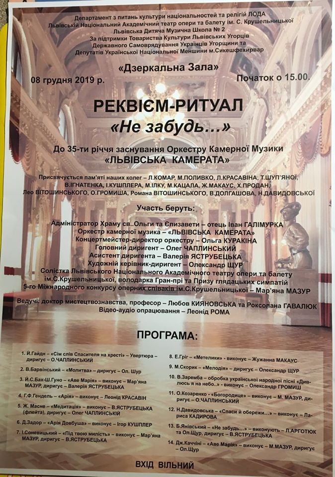 До 35-ти річчя заснування Оркестру Камерної Музики «ЛЬВІВСЬКА КАМЕРАТА», колектив вирішив особливим концертом-реквіємом вшанувати пам’ять колег та відомих музикантів й митців – Л. КОМАР, М. ПОЛИВКО, Л. КРАСАВІНА, Т. ШУП’ЯНОЇ, В. ІГНАТЕНКА, І. КУШПЛЕРА, М. ІЛКУ, М. КАЦАЛА, Ж. МАКАУС, Х. ПРОДАН, Л. ВІТОШИНСЬКОГО, О. ГРОМИША, Р. ВІТОШИНСЬКОГО, В. ДОЛГАШОВА, Н. ДАВИДОВСЬКОЇ.