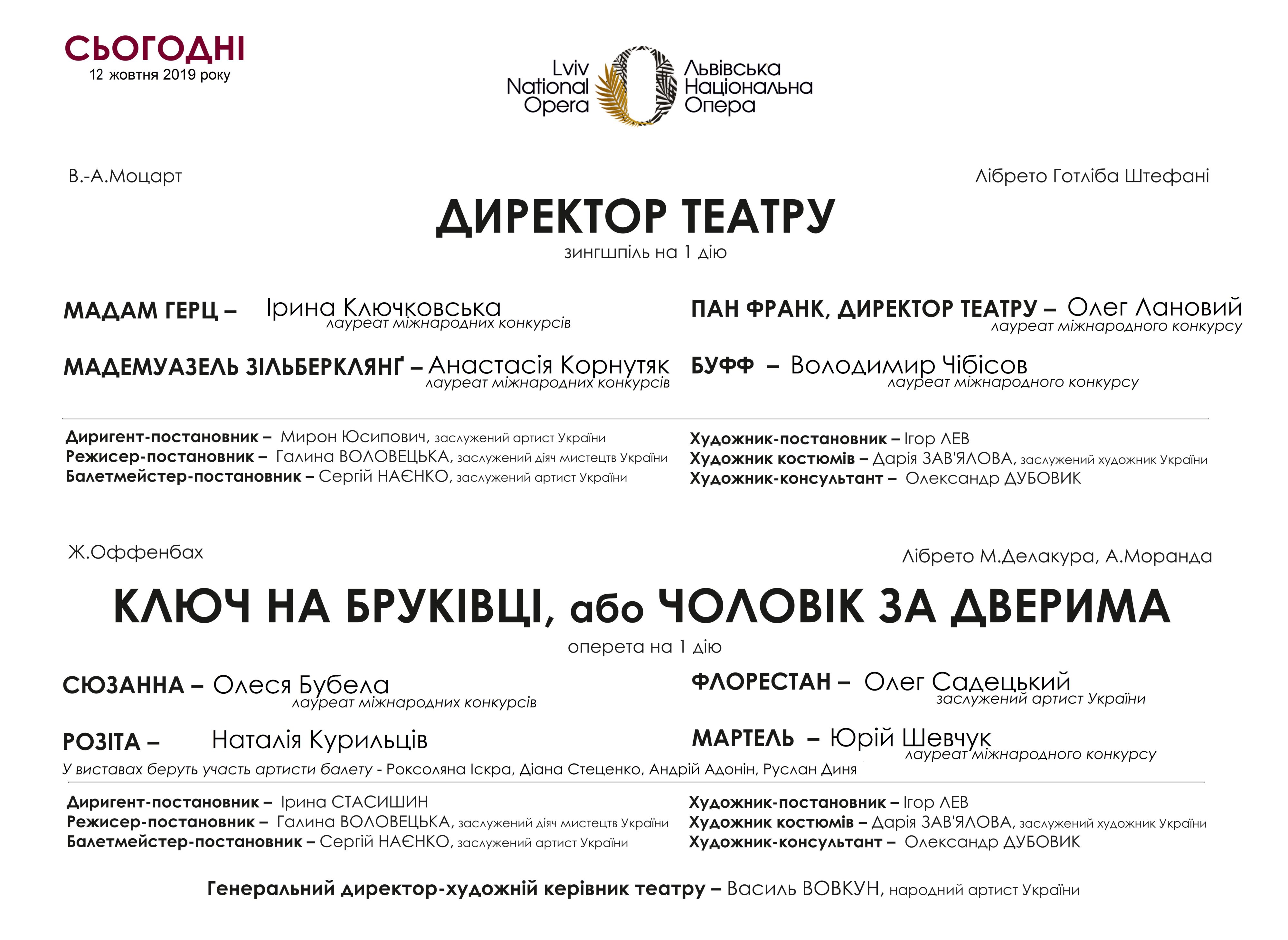 Прем’єра зинґшпілю «Директор театру» В.-А.Моцарта й оперети «Ключ на бруківці» Ж.Оффенбаха
