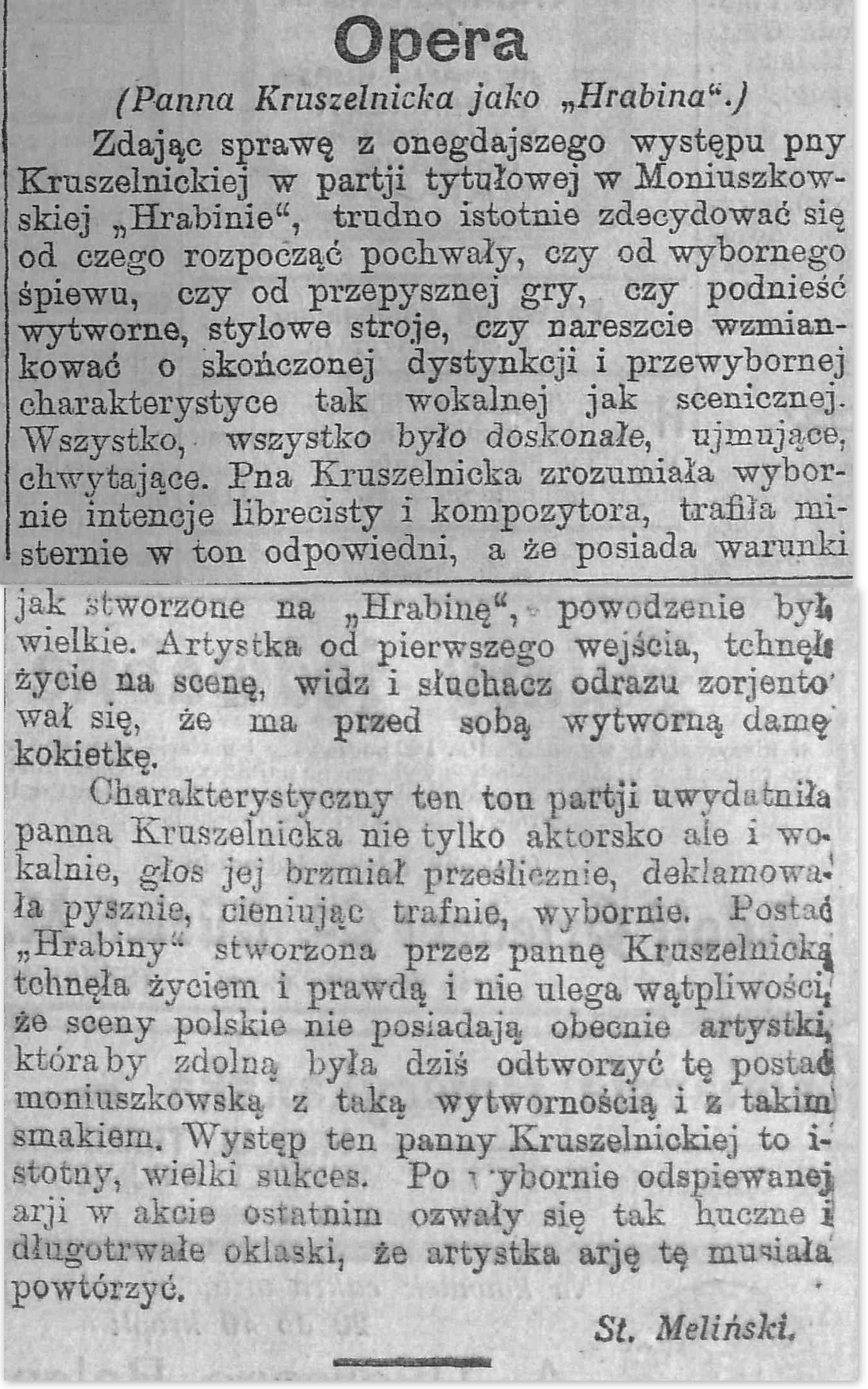 Той характерний тон партії пані Крушельницька підкреслила не тільки акторсько, але й вокально, голос її звучав прекрасно, декламувала пишно, акцентувала влучно, чудово. Образ Графині створений пані Крушельницькою дихав життям і правдою, й немає ніякого сумніву в тому, що польська сцена тепер не має артистки, яка була б здатною відтворити цей образ Монюшка з такою досконалістю, з таким смаком. Цей виступ пані Крушельницької – це істотний, величезний успіх. Після чудово заспіваної арії в останній дії, були такі гучні і тривалі овації, що артистка мусила повторити арію».