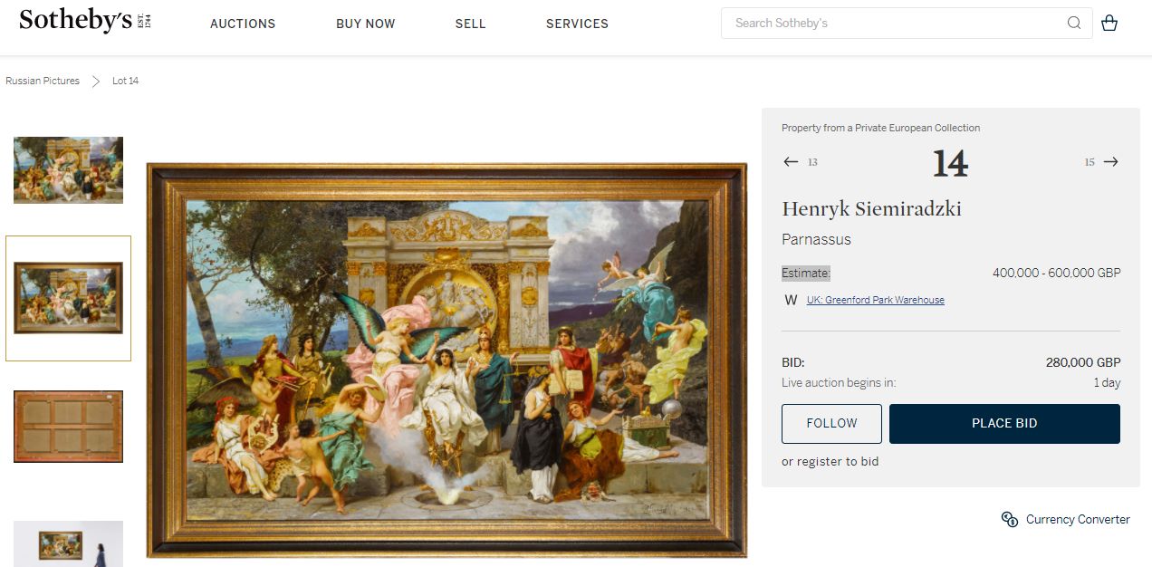 За даними офіційного сайту аукціону Sotheby`s, на продаж виставлено унікальний мистецький артефакт – зменшену в масштабі копію театральної завіси “Парнас” польського художника Генрика Семирадського. Оцінена вартість сягає близько 600 тис. фунтів стерлінгів.