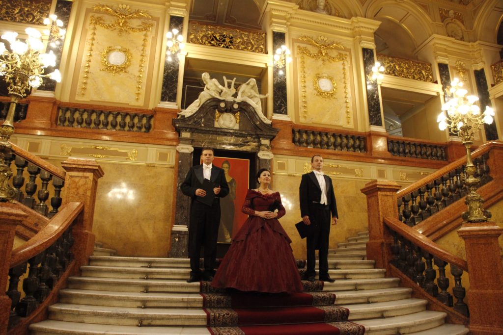 При знайомстві з театром відвідувачі спочатку потрапляють у фойє. Там на них уже чекають костюмовані екскурсоводи. Розказують про архітектурний витвір Зиґмунта Ґорґолевського і вмикають голос патронеси театру Соломії Крушельницької.