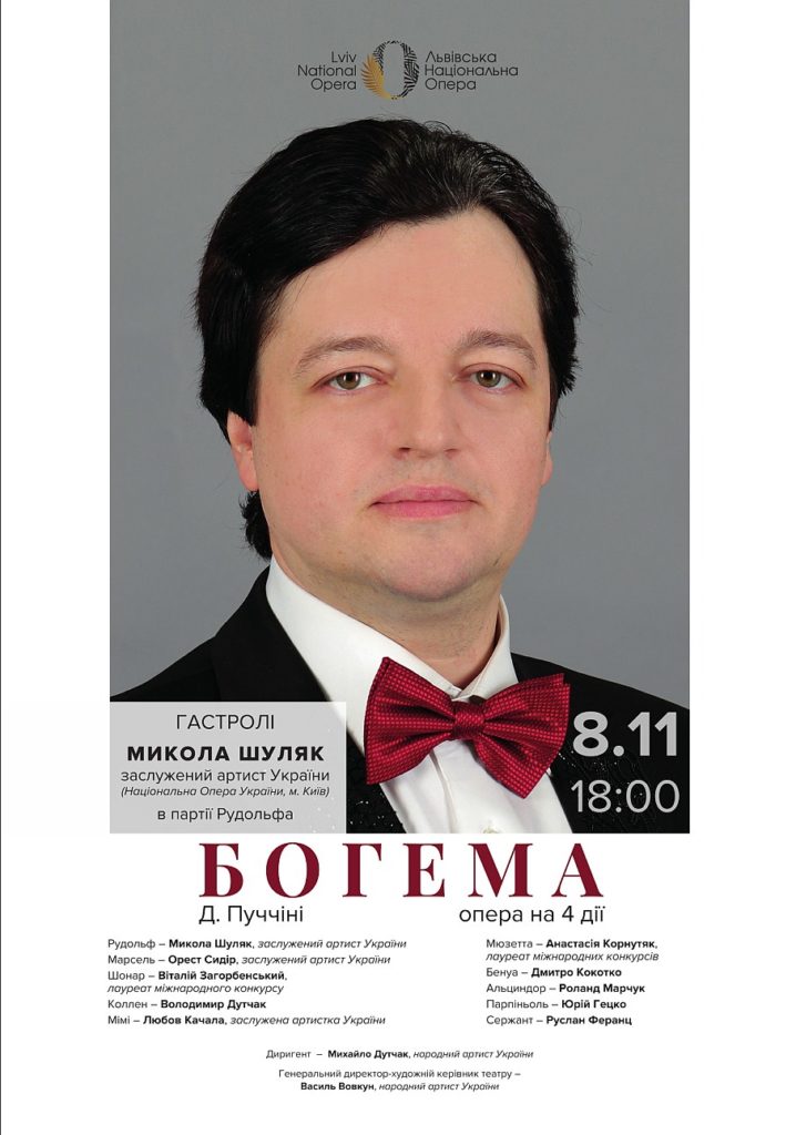 8 листопада 0 18-ій годині в опері “Богема” Д.Пуччіні виступить провідний соліст Національного театру опери та балету імені Тараса Шевченка (м.Київ), заслужений артист України Микола Шуляк. Артист, якому аплодують не лише в Україні, а й за кордоном – і в оперних виставах, і в сольних концертах – він завжди захоплює чудовим вокалом і майстерною акторською грою.