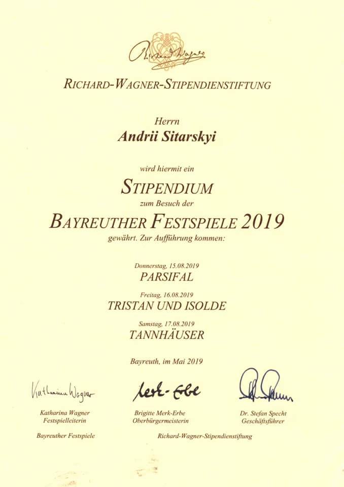 Цього року він став Ваґнерівським стипендіатом серед митців України та відвідав Фестиваль Ріхарда Ваґнера у Байройті. Заснований самим Ваґнером, фестиваль щороку представляє опери лише цього композитора. Цьогоріч гості фестивалю мали змогу почути музичні драми «Парсіфаль», «Трістан та Ізольда» і «Тангойзер».