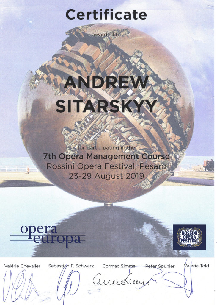 Наприкінці серпня Андрій Сітарський перейняв європейський досвід у сфері культурного менеджменту на курсах «Opera Management» у місті Пезаро (Італія). Тижневі курси, організовані асоціацією «Opera Europa», мали насичені лекторні і практичні заняття. Учасники курсів, а це 32 культурні менеджери зі всієї Европи, вдосконалювали навички за такими напрямками, як маркетинг та комунікації, робота з персоналом, фінансова діяльність оперних театрів, створення нових постановок, фандрейзинг та інше.