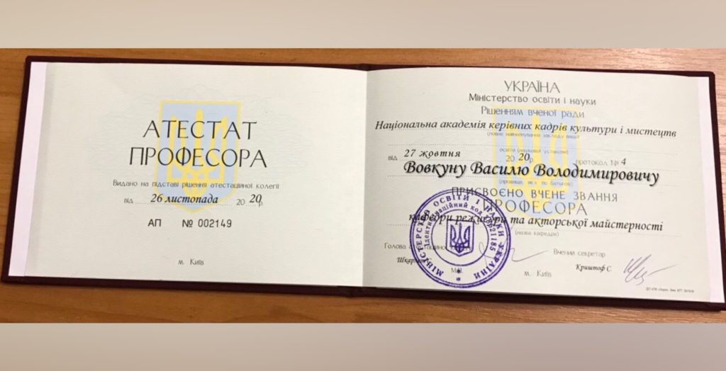 Відповідне рішення було затверджено Міністерством освіти і науки України за клопотанням вченої ради Національної академії керівних кадрів культури і мистецтв, де Василь Вовкун багаторічно викладає на кафедрі режисури та акторської майстерності.