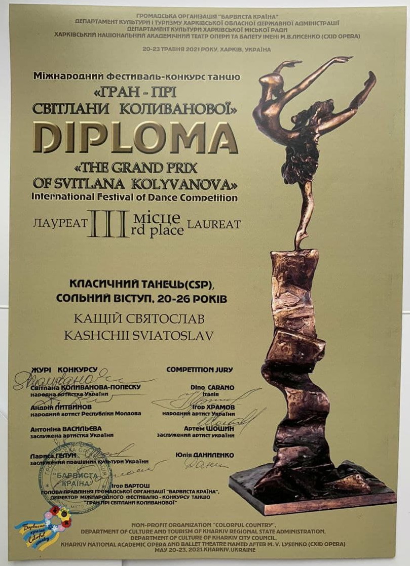 Вітаємо артиста балету Львівської національної опери Святослава Кащія зі здобуттям 3-ої премії за кращий сольний виступ (виконання класичного танцю) на Міжнародному фестивалі-конкурсі танцю «Гран-прі Світлани Коливанової»!