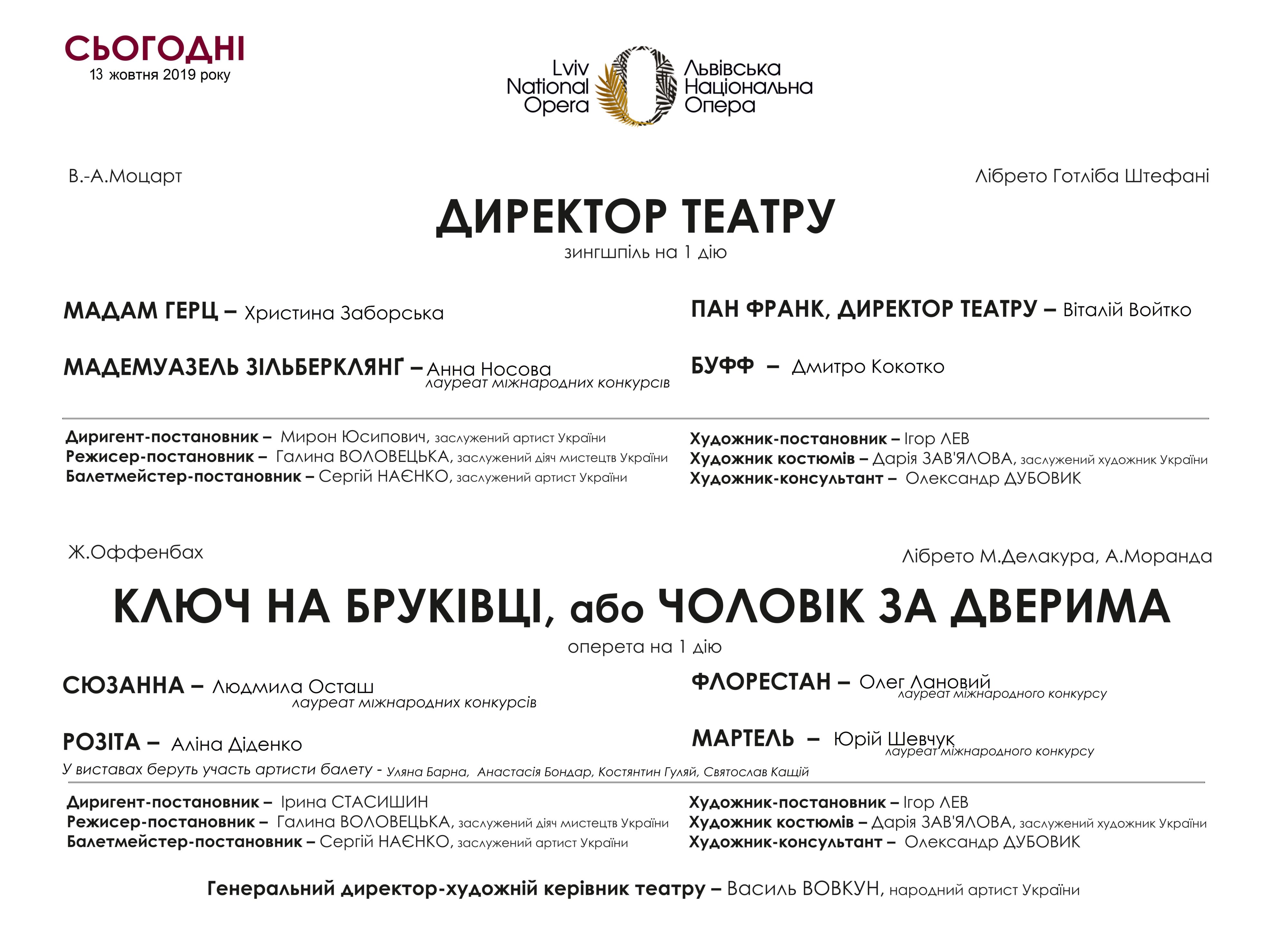 Вітаємо з другою прем’єрною виставою – зингшпилю «Директор театру» В.-А.Моцарта та оперети « Ключ на бруківці» Ж.Оффенбаха!