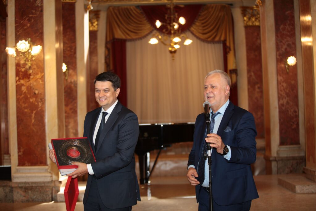На згадку про сьогоднішню подію Василь Вовкун вручив Дмитру Разумкову сувенірну тарілку Львівської національної опери, а також альбом «Євген Лисик: графіка, малярство» з роботами славетного художника театру, спадщина якого належить до Золотого фонду театру.