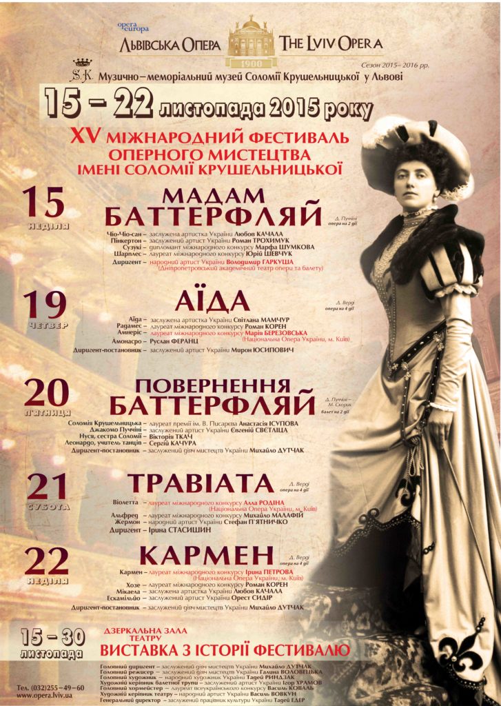 Із 15 до 22 листопада 2015 р. у Львівській Національній Опері проходитиме ХV міжнародний фестиваль оперного мистецтва імені Соломії Крушельницької. У його репертуарі – опери «Мадам Баттерфляй»Д.Пуччіні (15.ХІ ), «Аіда» (19.ХІ) та «Травіата» (21.ХІ) Д.Верді і «Кармен» Ж.Бізе (22.ХІ), а також балет «Повернення Баттерфляй» Д.Пуччіні-М.Скорика (20.ХІ)..