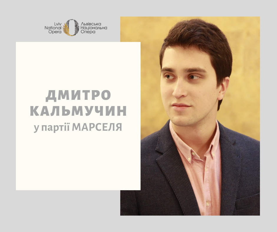 8 травня о 18:00 в опері “Богема” Дж. Пуччіні вперше партію художника Марселя виконуватиме Дмитро Кальмучин, лауреат міжнародних конкурсів (баритон).