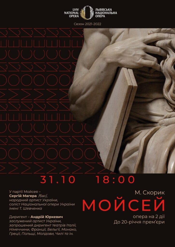 31 жовтня 2021 року на сцені Львівської національної опери відбудеться опера «Мойсей» Мирослава Скорика – ювілейна вистава до 20-річчя прем’єри опери.