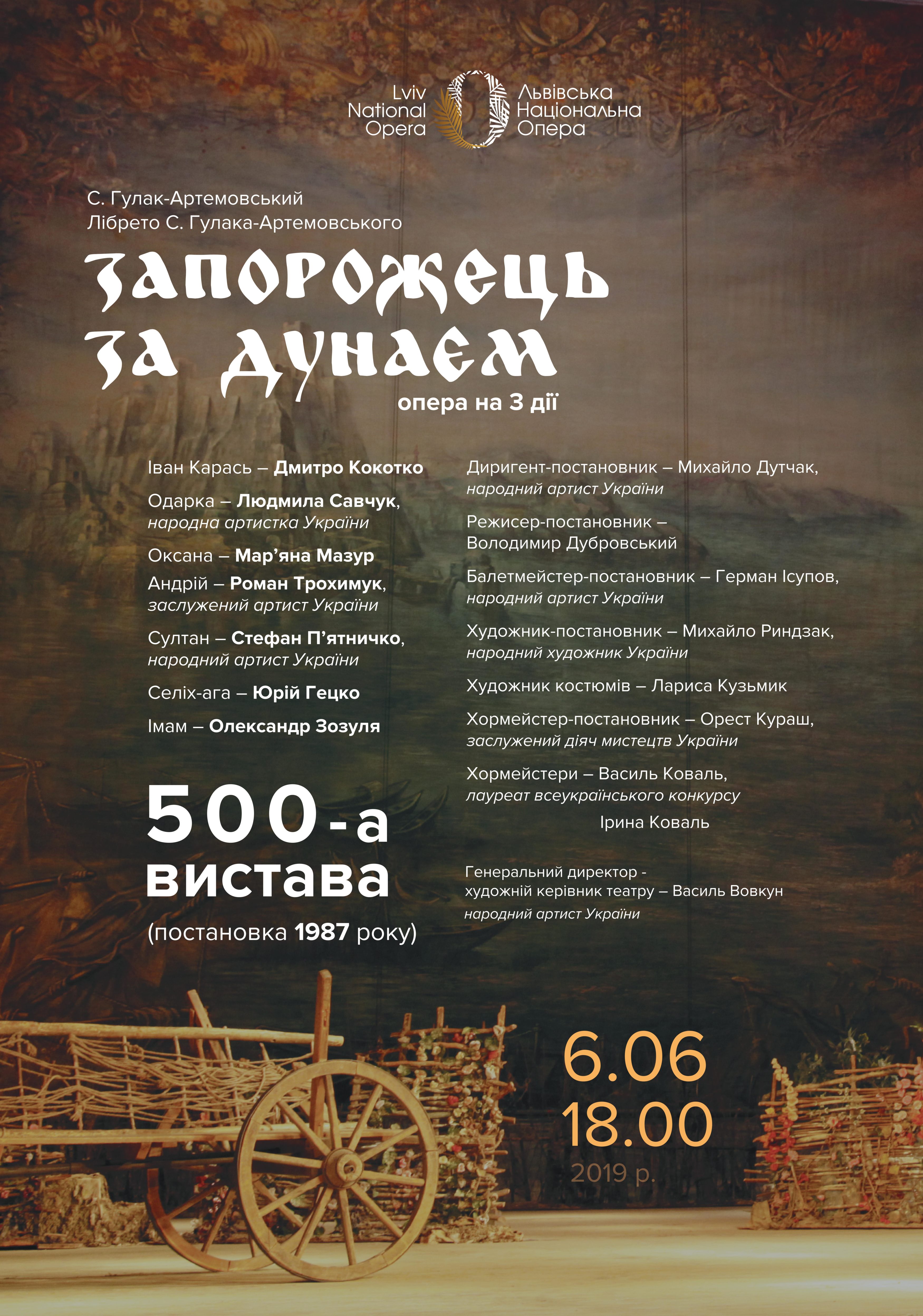 Сьогодні, 6 червня, о 18-ій годині тільки що розпочалася вистава “Запорожець за Дунаєм” Семена Гулака-Артемовського – перша опера, лібрето якої базувалося на українській історії й герої якої оповідали цю історію українською мовою. Святкова публіка урочисто заповнила зал Львівського національного академічного театру опери та балету імені Соломії Крушельницької. Цей спектакль особливий – 500-ий від часу його Прем’єри в 1987 році.