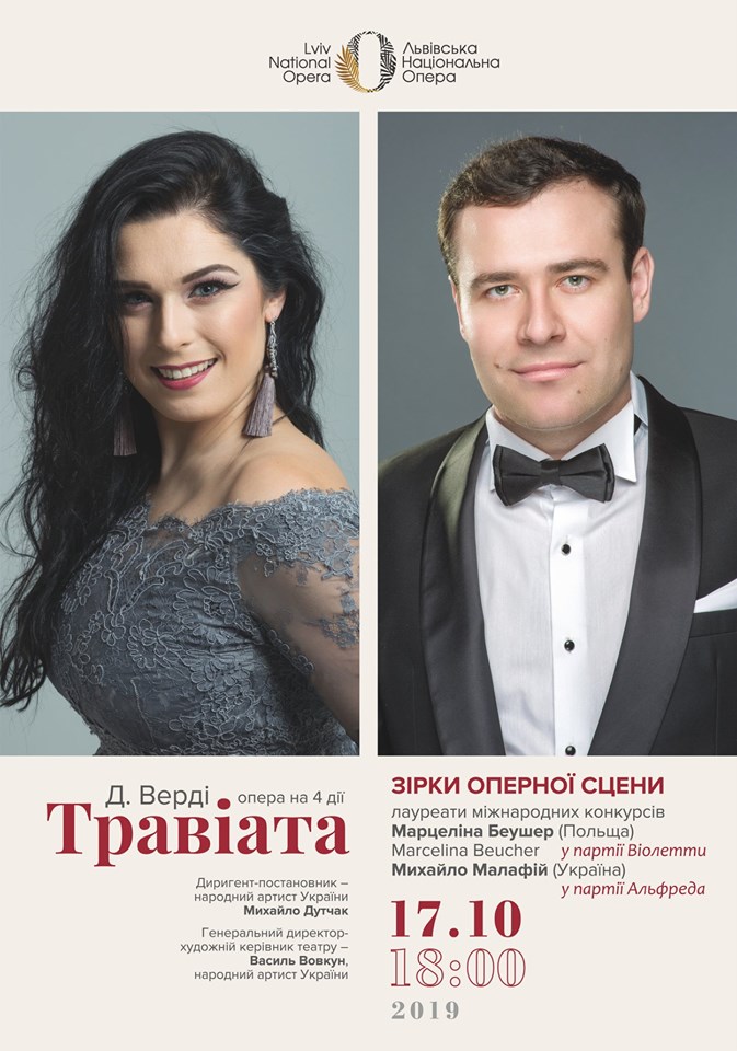 17 жовтня Львівська Національна Опера презентувала одну з найкращих опер репертуару: “Травіата” Д.Верді. Публіка подарувала виконавцям повний аншлаг, шалені овації та вигуки “Браво!”, щиро і тепло зустрічаючи наших зіркових гостей та усіх учасників вистави! У супроводі симфонічного оркестру під орудою головного диригента театру народного артиста України Михайла Дутчака (Михайло Дутчак) у головних партіях виступили: запрошені зірки світової оперної сцени лауреати міжнародних конкурсів Марцеліна Беушер Marcelina Beucher(Польща) Marcelina Beucher Sopran у партії Віолетти та Михайло Малафій Mykhailo Malafii у партії Альфреда!